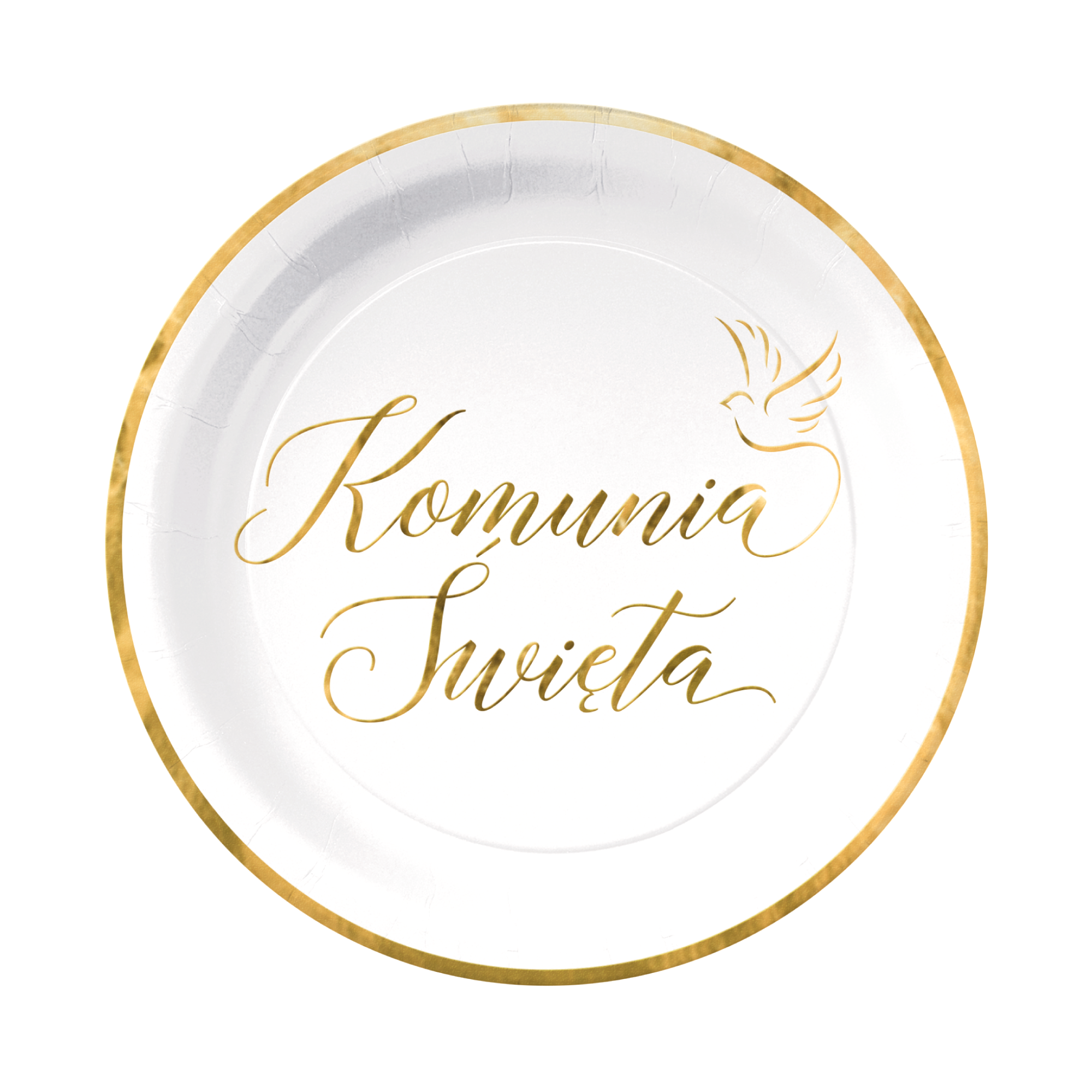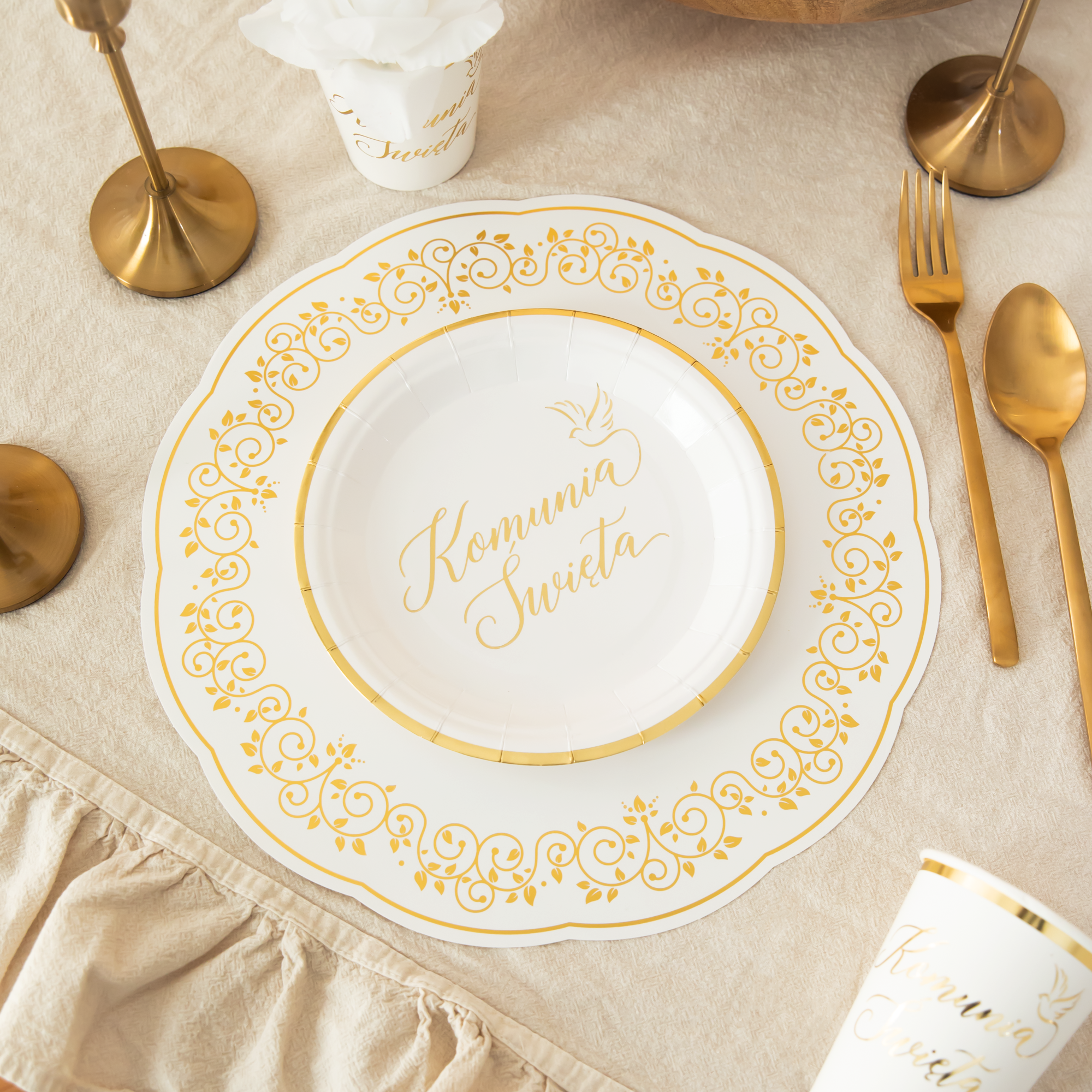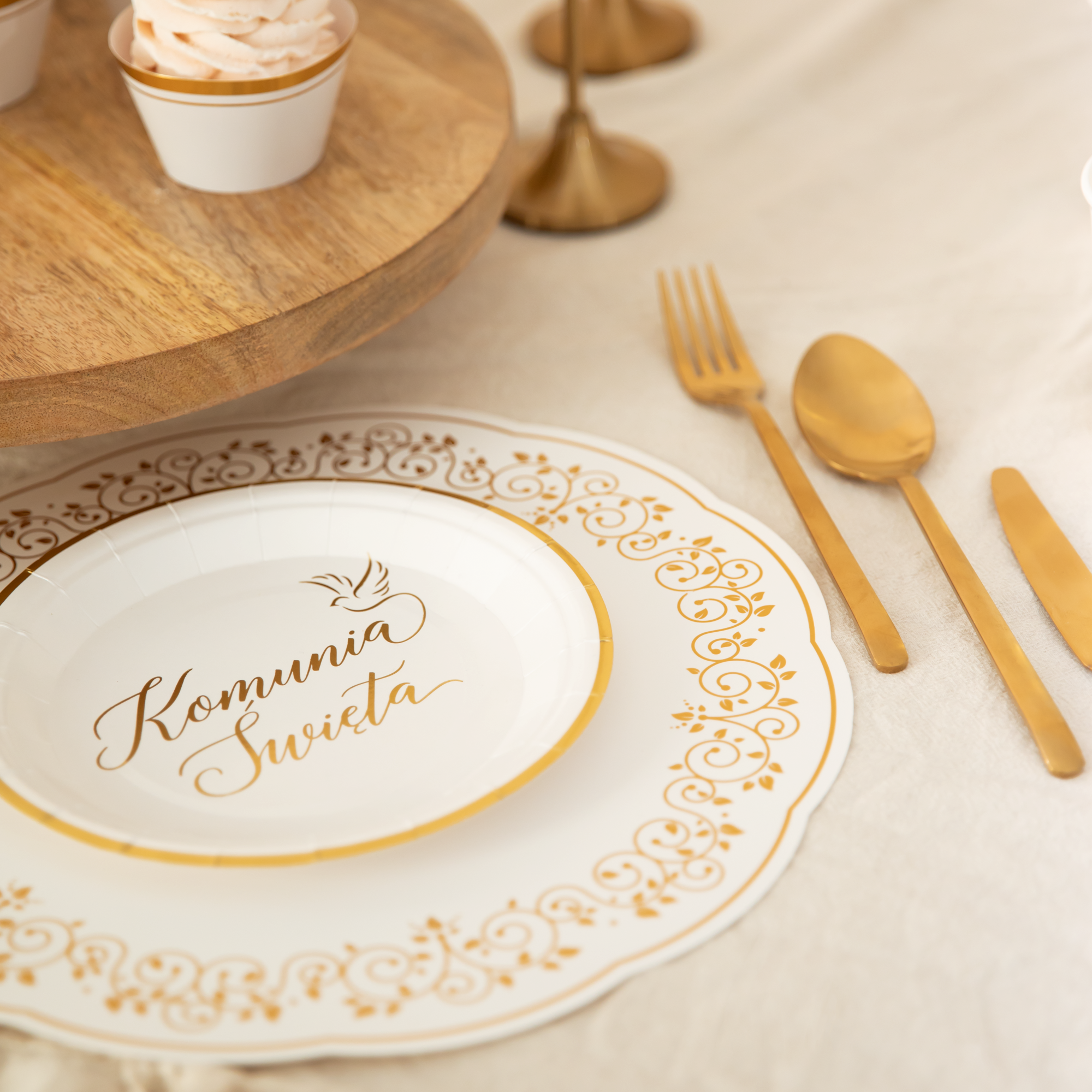 Talerzyki biało złote 18 cm 1 op. / 6 szt - papierowe I Komunia Święta