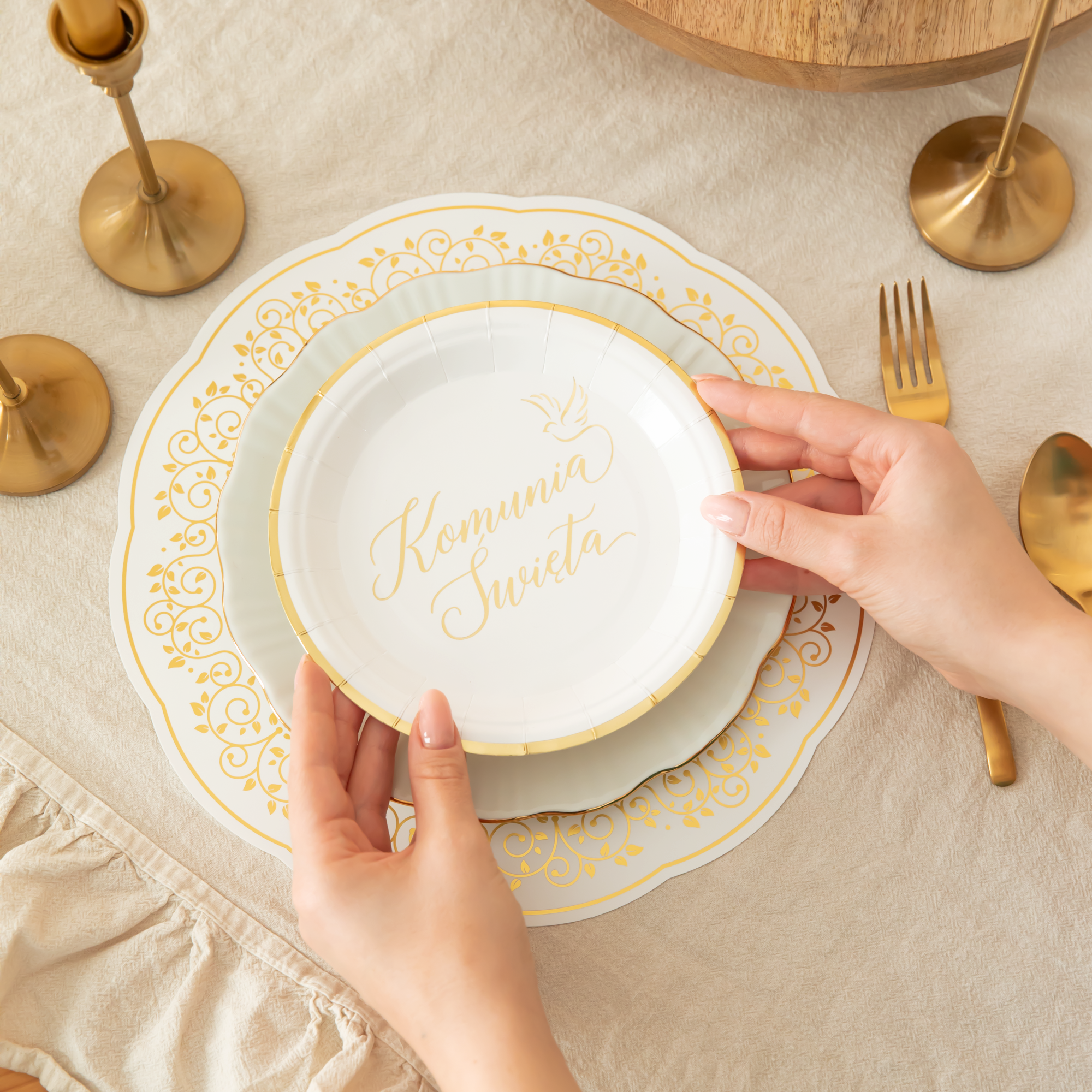 Idealne aby sprawić by uroczystość przyjęcia Sakramentu I Komunii Świętej została zapamiętana przez gości. Cudowna aranżacja i wyjątkowe dodatki, które zachwalają wszyscy zaproszeni. Cudowny dodatek dekoracyjny na Pierwszą Komunię Świętą. Bardzo eleganckie talerzyki ekologiczne, posiadają przepiękne złote wykończenie, które fantastycznie odbijają światło. Pięknie wyglądają na stole komunijnym przy talerzach gości.