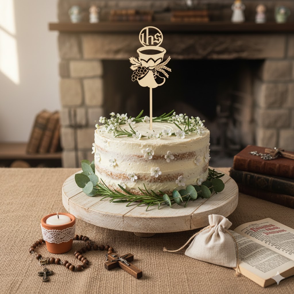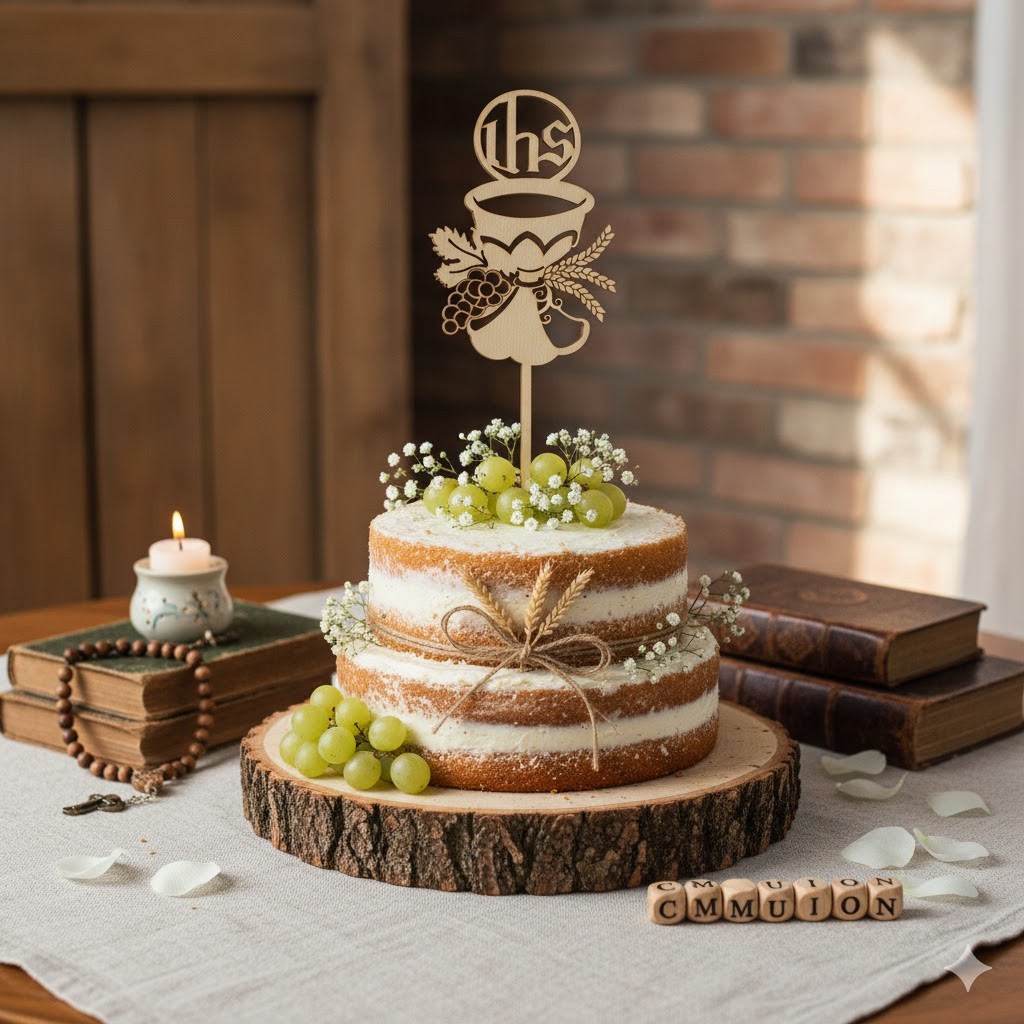 Topper komunijny w formie drewnianego pikera to subtelna, naturalna dekoracja idealna na uroczystość Pierwszej Komunii Świętej. Wzór Kielicha Eucharystycznego podkreśla sakramentalny charakter wydarzenia, a minimalistyczny styl sprawia, że topper pasuje do każdej aranżacji – zarówno klasycznej, jak i nowoczesnej.
