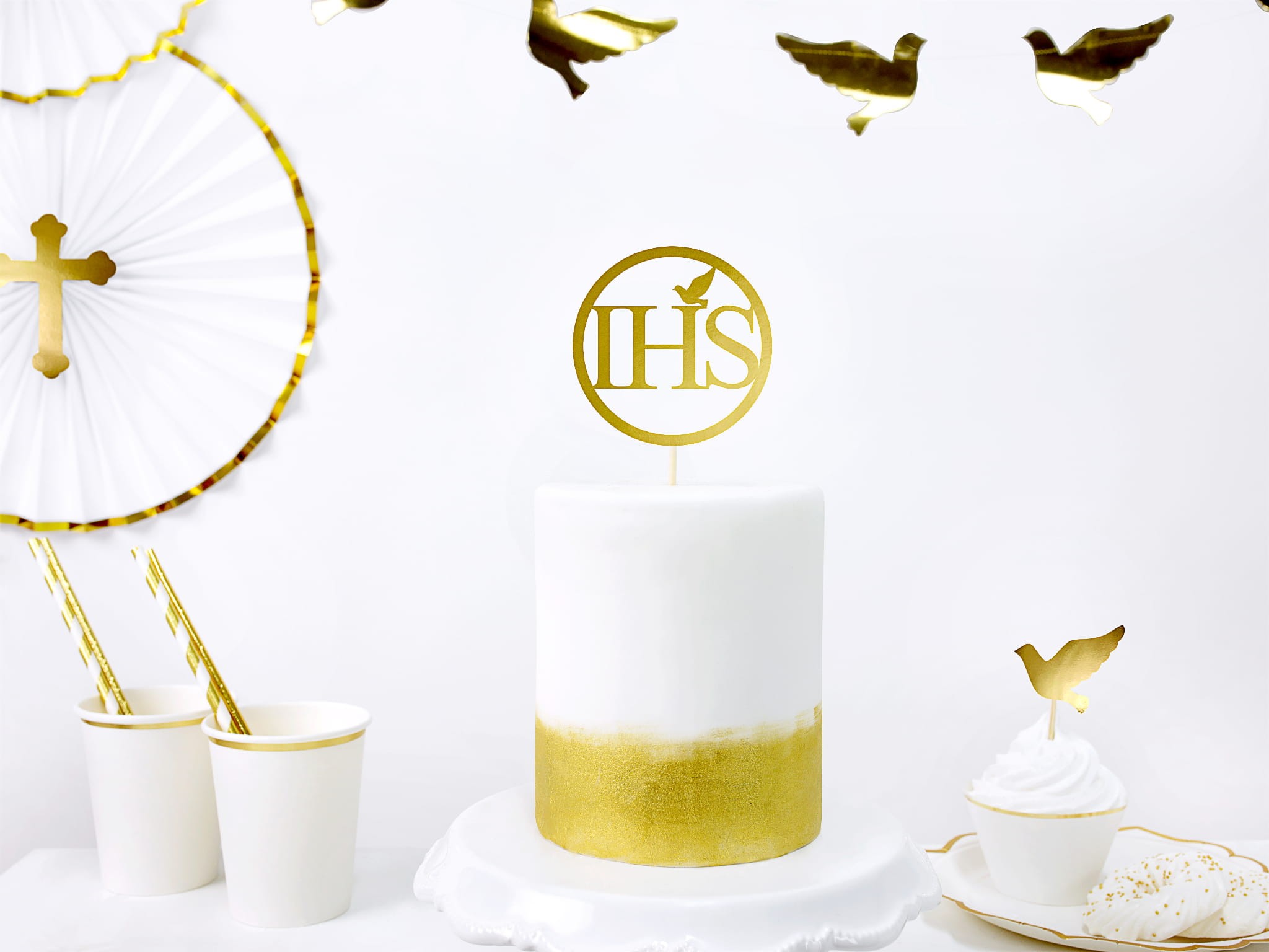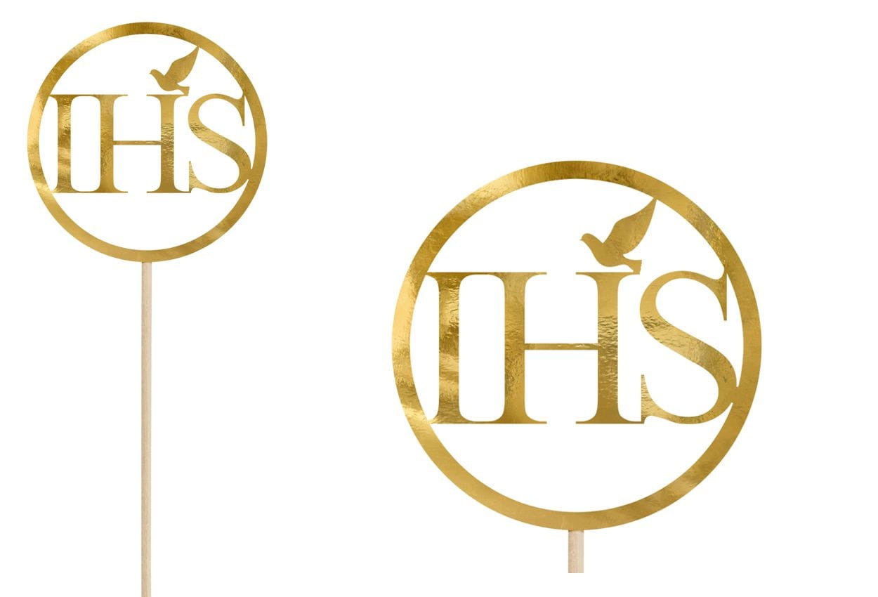 Piker wykonany z papieru w kolorze złotym lustrzanym, stanowi idealny dodatek do dekoracji tortów i ciast podczas uroczystości I Komunii Świętej.