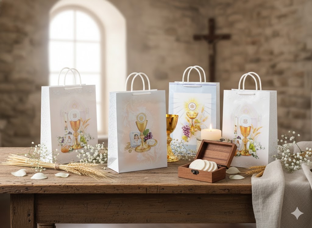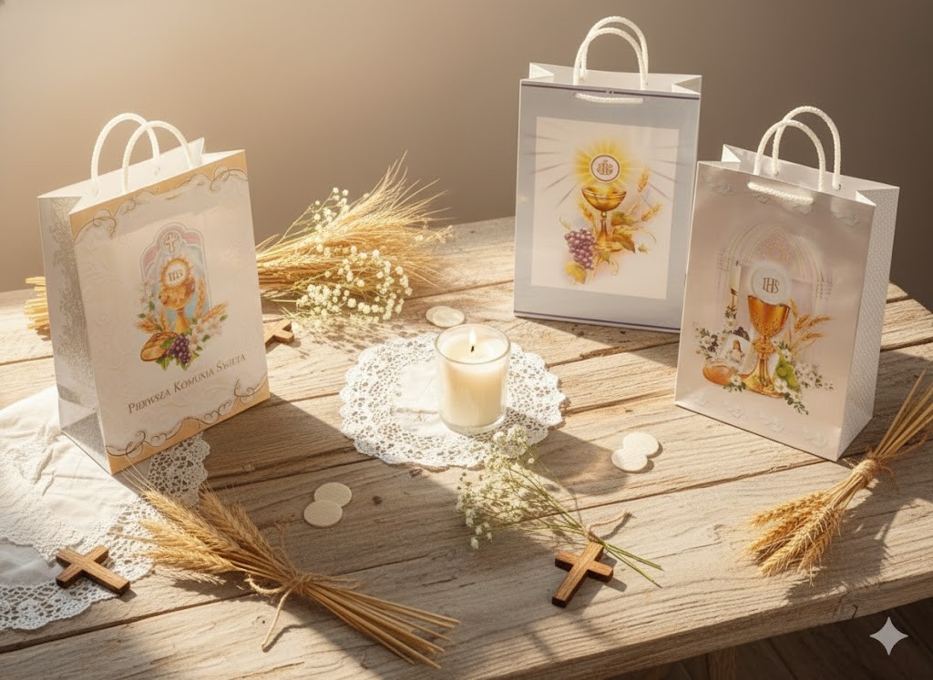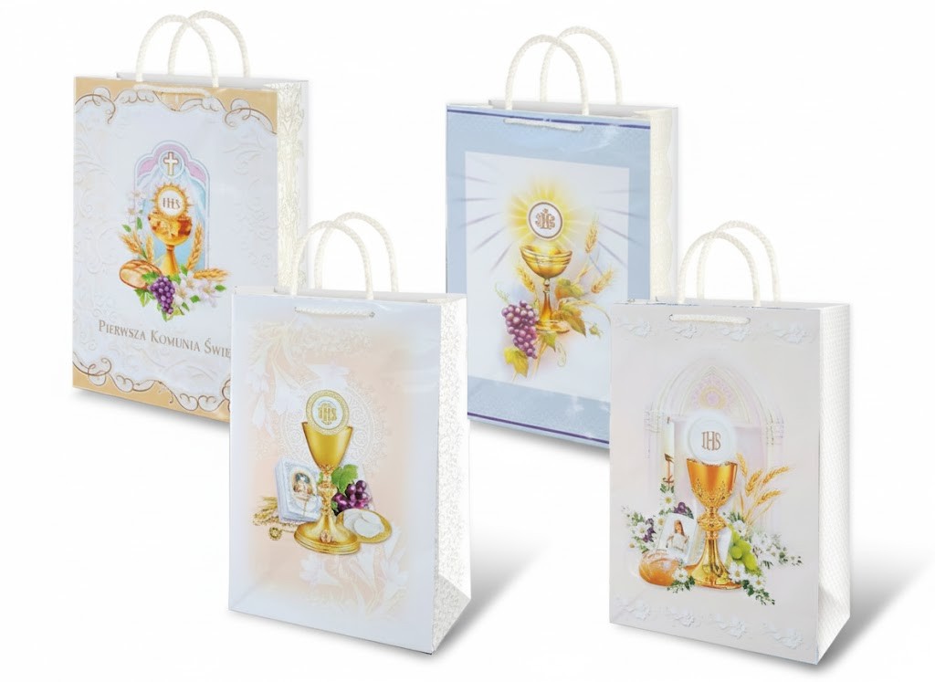 Elegancka, wytrzymała i pełna symboliki torba prezentowa to niezbędny dodatek do wręczenia pamiątki z okazji Pierwszej Komunii Świętej. Dzięki niej każdy podarunek — czy to Biblia, różaniec, medalik, album, pamiątka komunijna lub kartka z życzeniami — zyska wyjątkową oprawę podkreślającą duchowy charakter uroczystości.