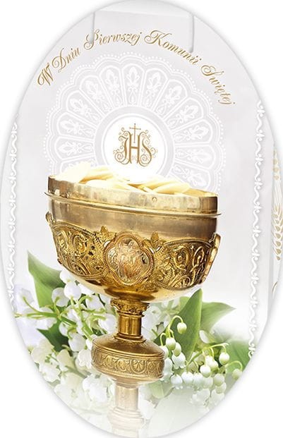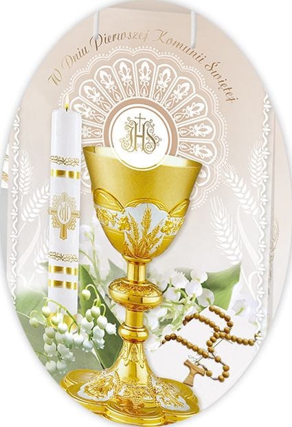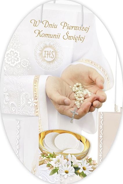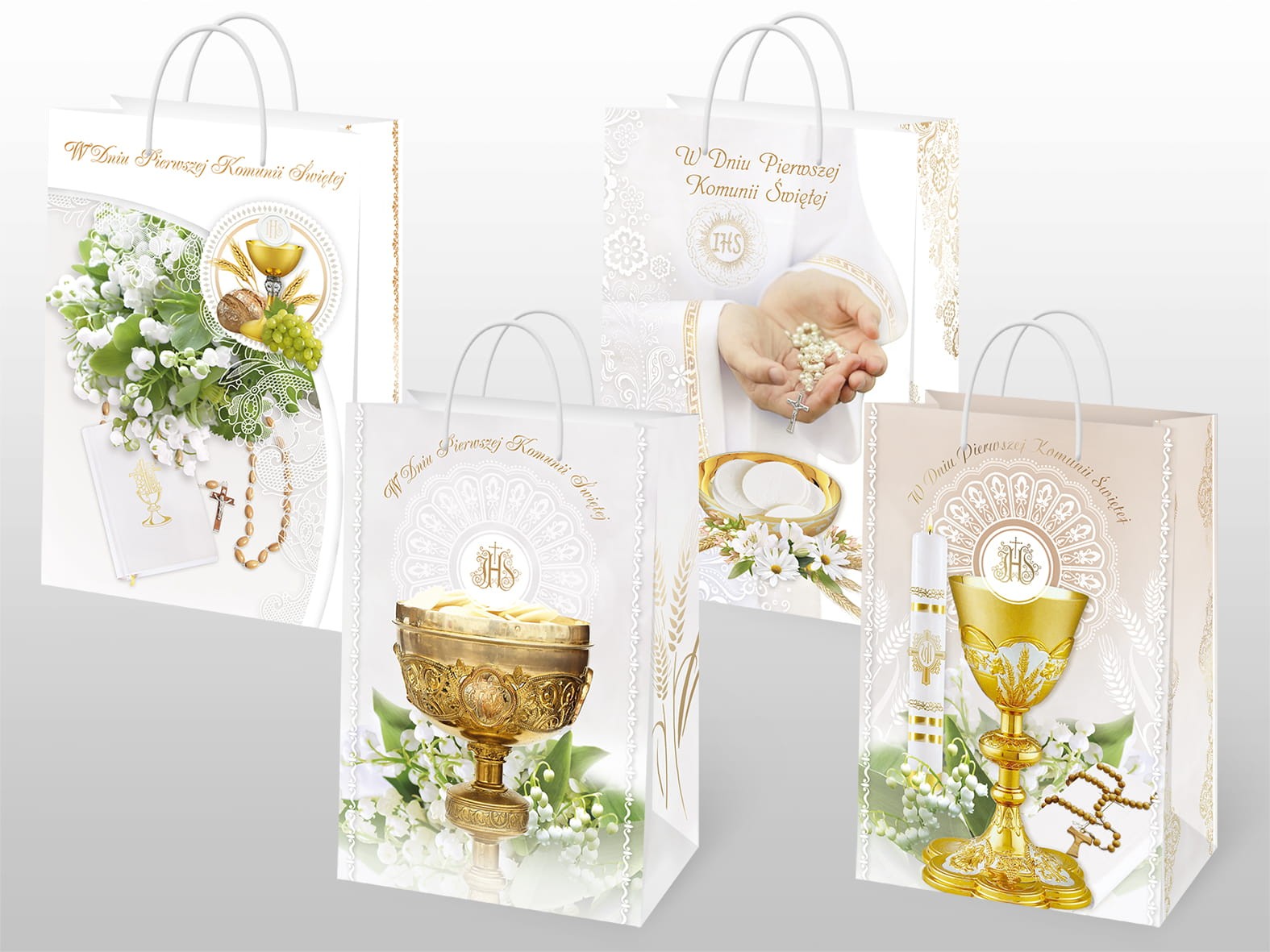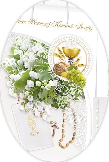 Torba z motywem komunijnym, wykonana z papieru mat o gramaturze 128 g/m2 zadrukowanego w całości ozdobnym nadrukiem. Papier o dużej wytrzymałości ze wzmocnionym dnem i krawędziami w których mocowane są sznureczki/rączki.
