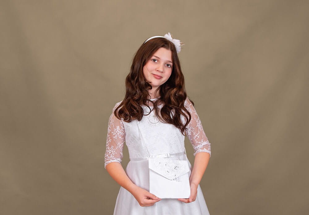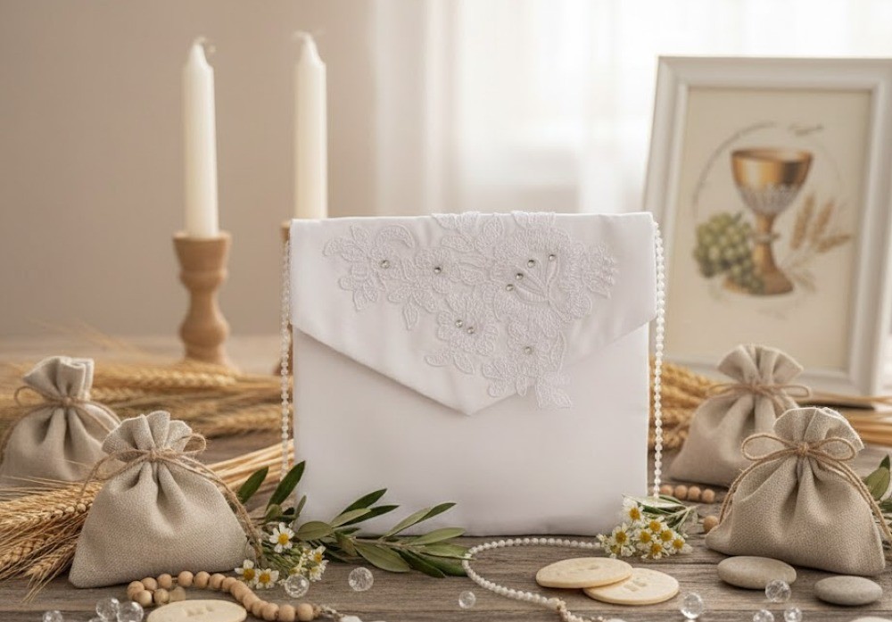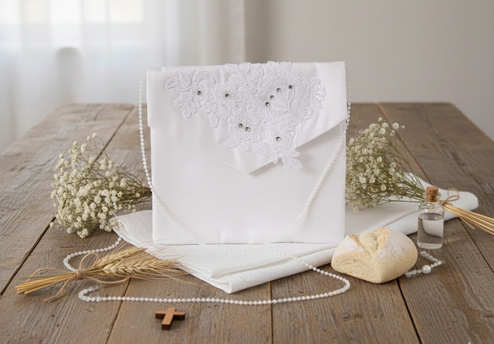 Ta torebka komunijna to połączenie klasycznej formy, delikatnego haftu i subtelnych kryształowych akcentów. Elegancka, spokojna i bardzo estetyczna – doskonale dopełnia strój komunijny i pozostaje piękną pamiątką na lata.
