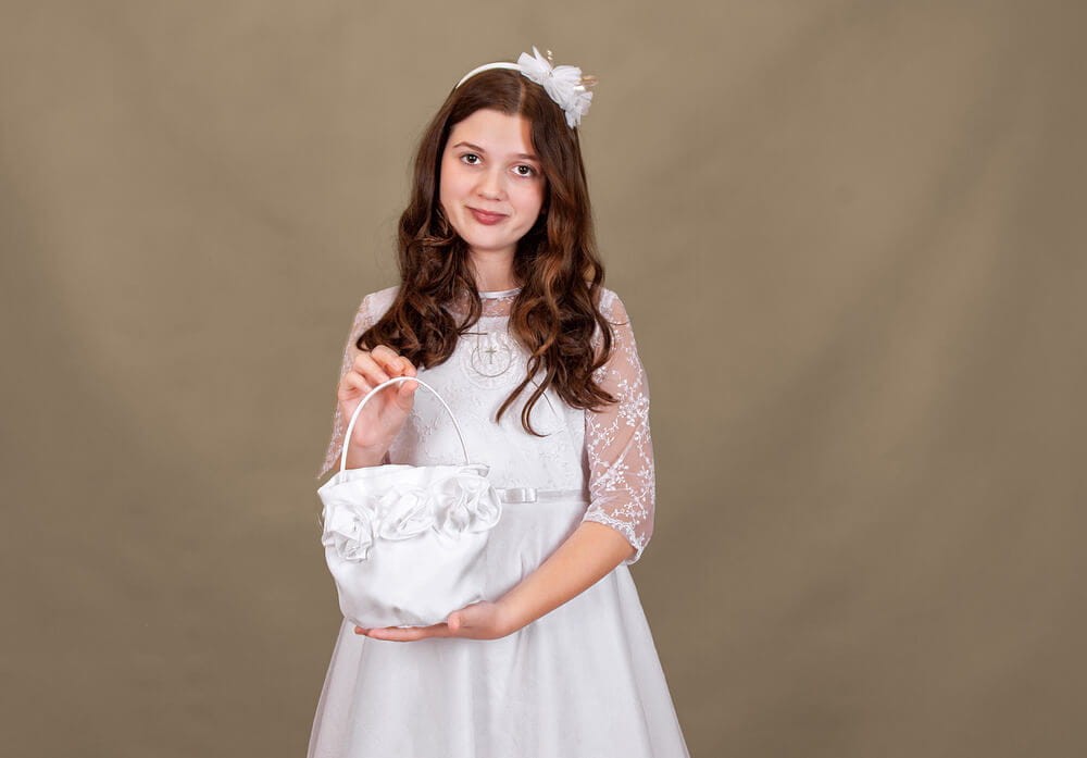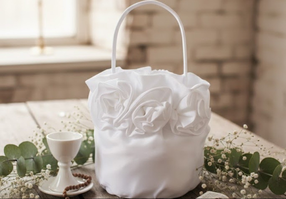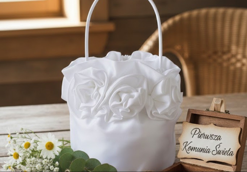 Torebka komunijna – elegancki koszyczek z satynowymi kwiatami
