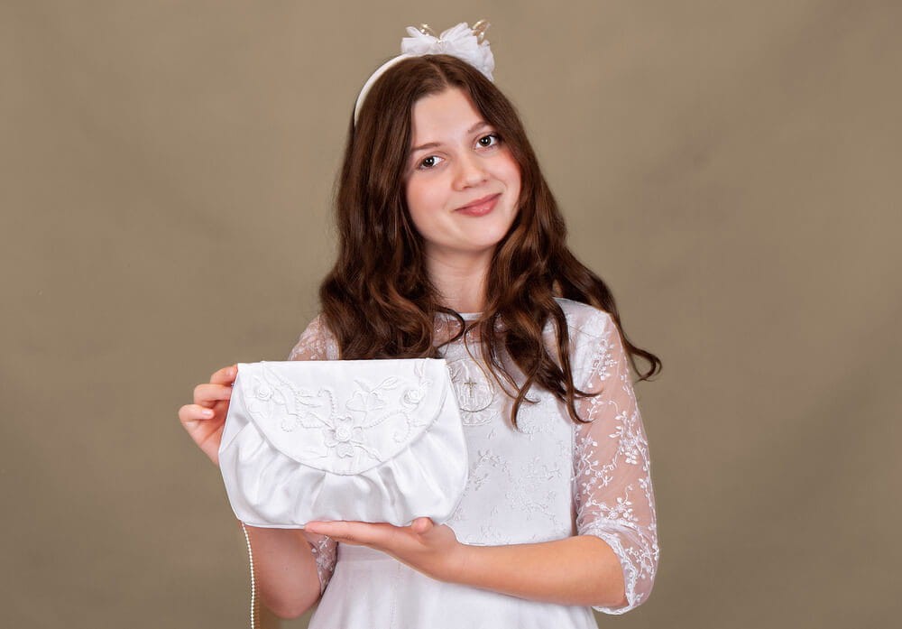Torebka doskonale komponuje się z klasycznymi wiankami komunijnymi, rękawiczkami oraz delikatną biżuterią religijną, tworząc spójną, jasną i bardzo elegancką całość.