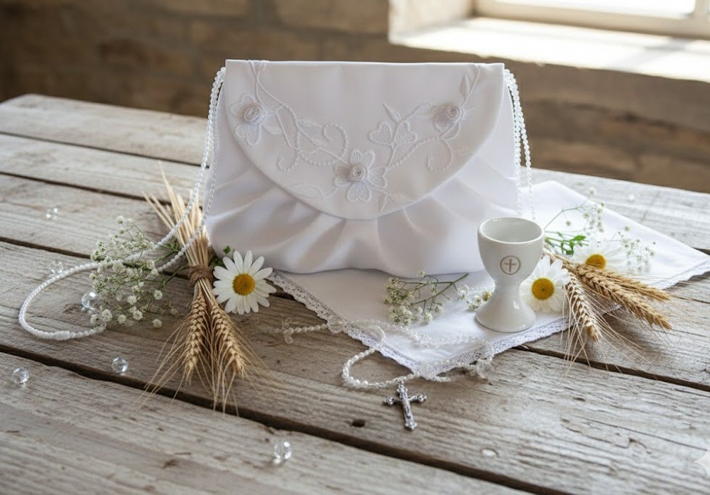 Ta torebka komunijna to idealny wybór dla osób ceniących tradycję, symbolikę i spokojną elegancję. Haft sakralny, klasyczna forma i jasna biel sprawiają, że jest to dodatek wyjątkowo godny — piękny w dniu uroczystości i wartościowy jako pamiątka na lata.