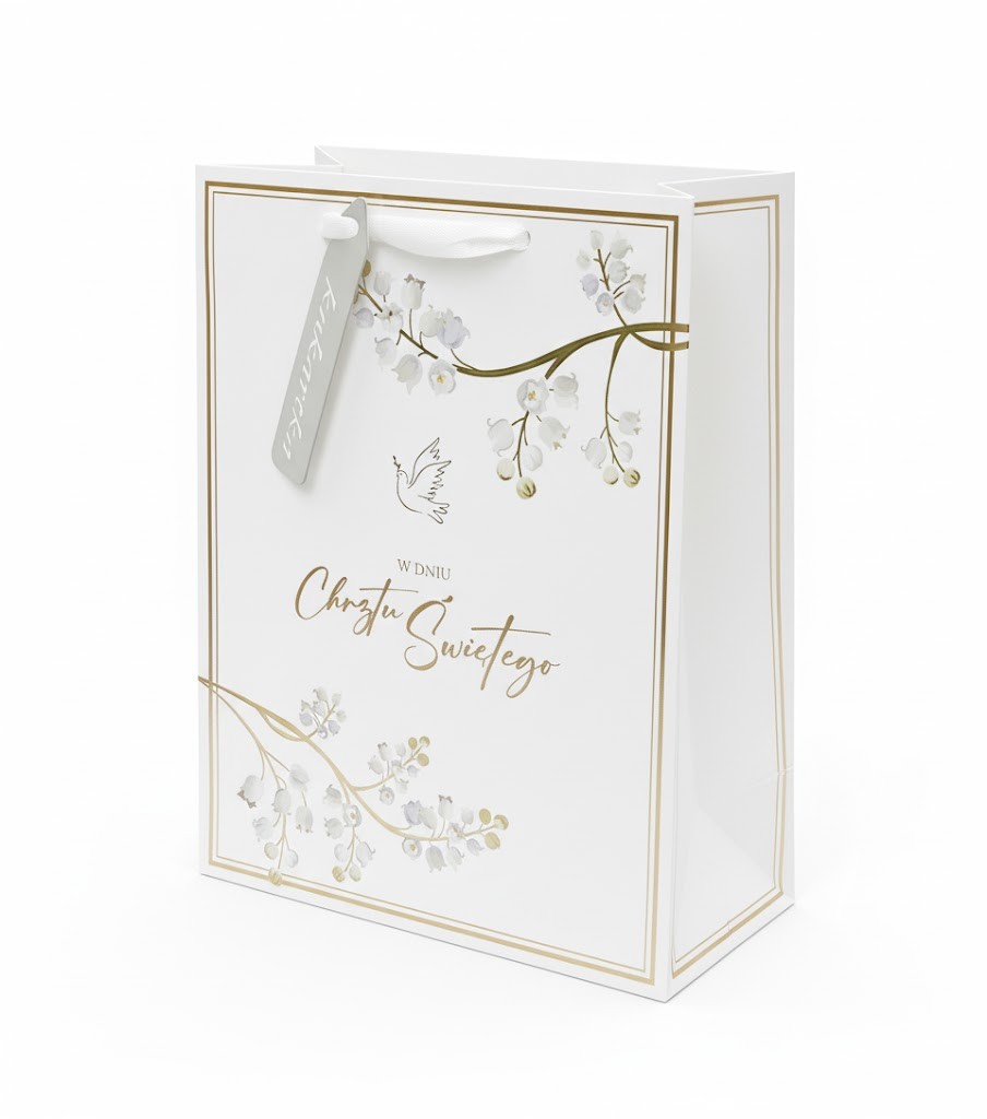 Włóż prezent do środka, dopasuj zawartość do wymiarów 22 × 17 cm, zasłoń delikatnie uchwyty i przedstaw w chwili wręczenia — torebka doskonale uzupełni moment sakramentu. Po użyciu może służyć także jako elegancka opakowanie pamiątkowe lub przechowalnia papierowych drobiazgów.