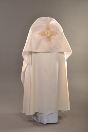 Welon na ramiona z tkaniny ecru ze złotą nitką. Zdobiony złotymi frędzlami i haftem, zapinany klamrą.