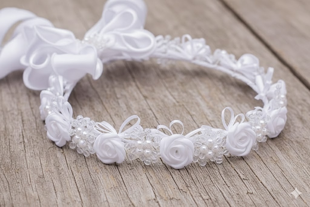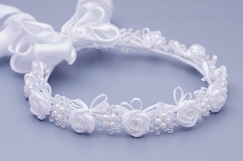Wianek komunijny – satynowa biel z perłowo-kryształowym wykończeniem