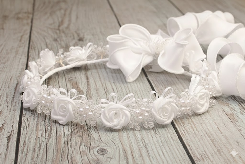 Wianek komunijny z najnowszej kolekcji to wyjątkowo elegancka i szlachetna propozycja, oparta na czystej, satynowej bieli. Kompozycję tworzą drobne satynowe różyczki, subtelne perełki oraz transparentne kryształki, które nadają całości delikatny, sakramentalny blask i bardzo uroczysty charakter.