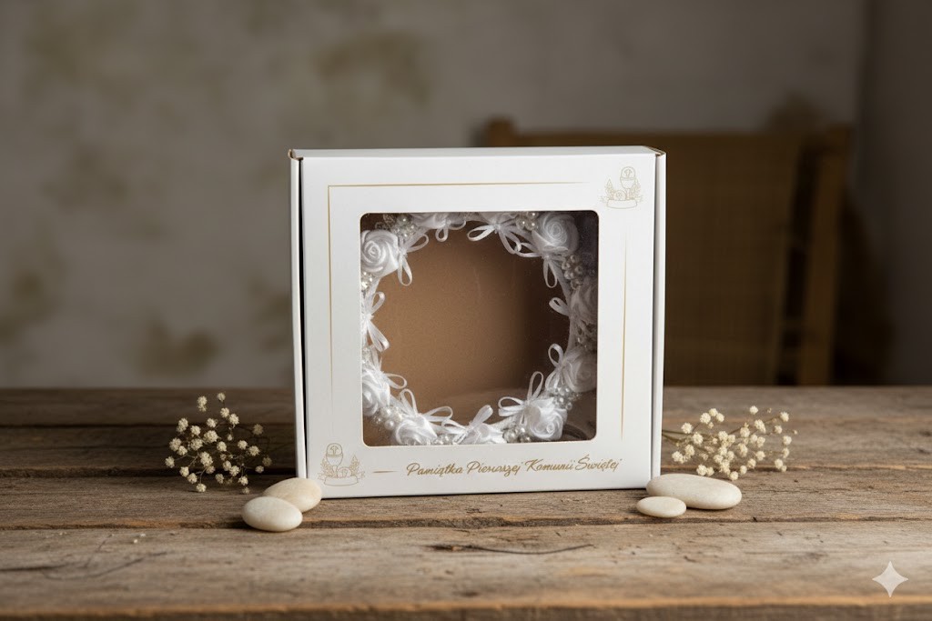 W e-Dewocjonalia dostępne są również eleganckie torebki komunijne, rękawiczki oraz delikatna biżuteria, które idealnie uzupełniają klasyczny charakter tego wianka.