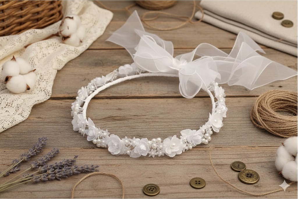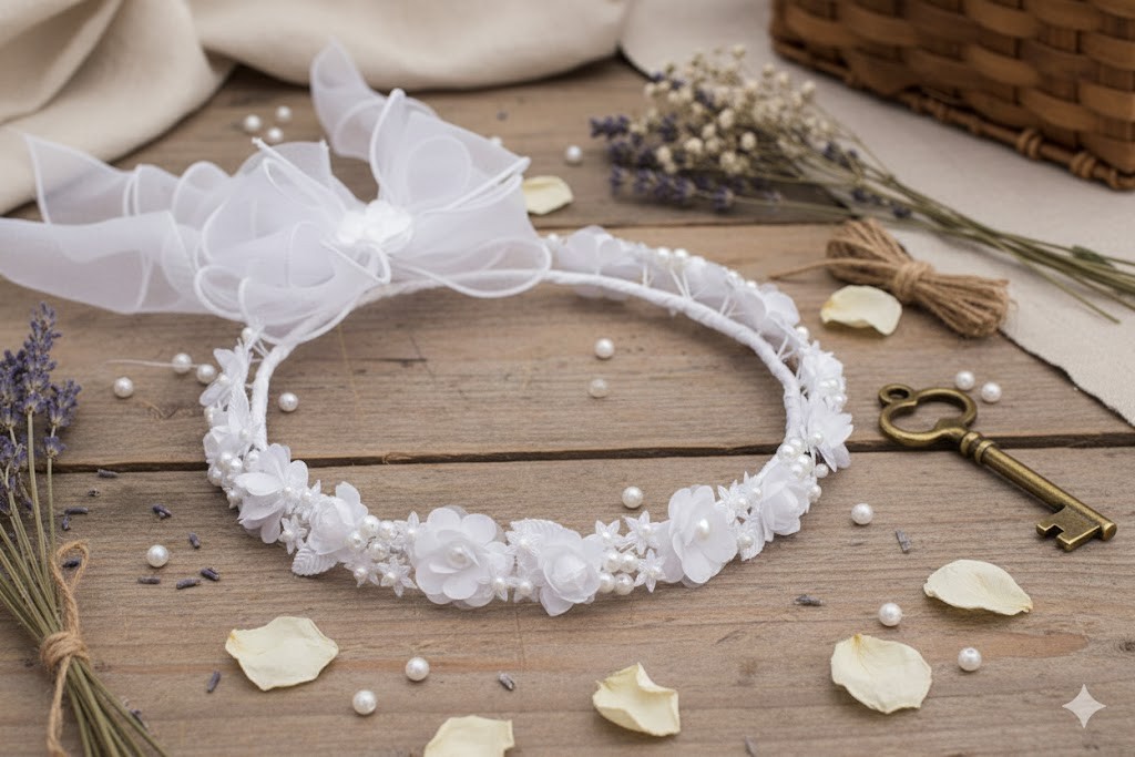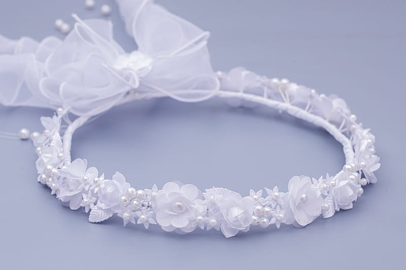 Ten wianek komunijny to propozycja dla osób ceniących maksymalną delikatność, lekkość i klasyczną elegancję. Subtelne kwiaty, perły i zwiewna kokarda tworzą harmonijną całość, która pięknie podkreśla wyjątkowy charakter Pierwszej Komunii Świętej i pozostaje pamiątką na długie lata.