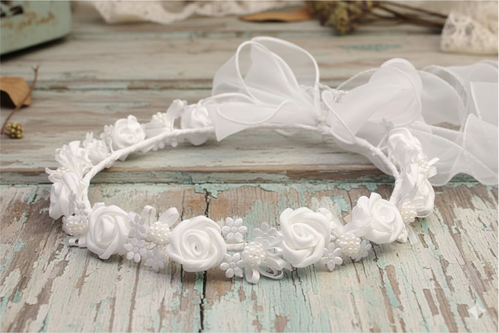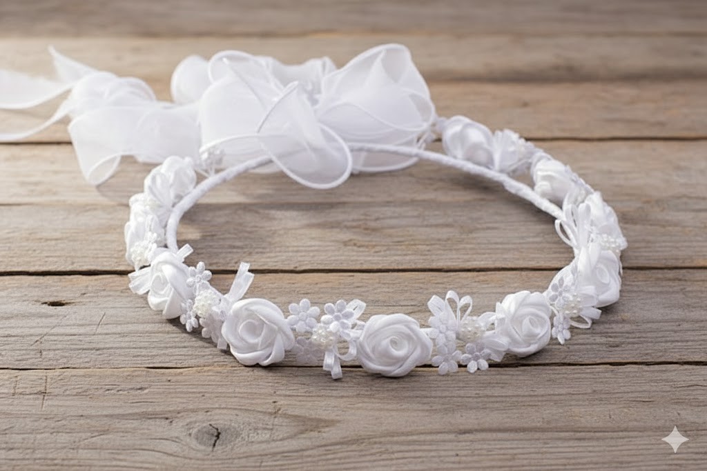 Wianek osadzony jest na elastycznym stelażu, ukrytym w konstrukcji, co pozwala na idealne dopasowanie do głowy dziecka bez ucisku i zsuwania się. Całość dopełnia delikatna kokarda z organzy z lekkimi wstążkami, podkreślająca sakramentalny i dziewczęcy charakter ozdoby.