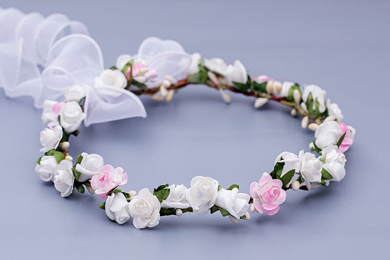 Wianek komunijny – klasyczna biel z delikatnym różowym akcentem