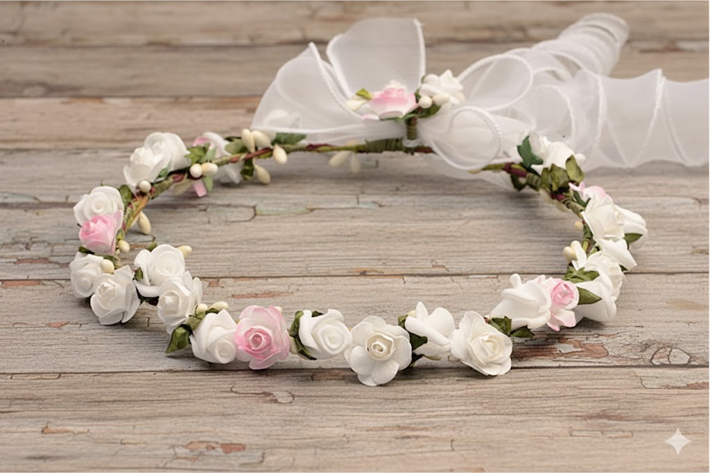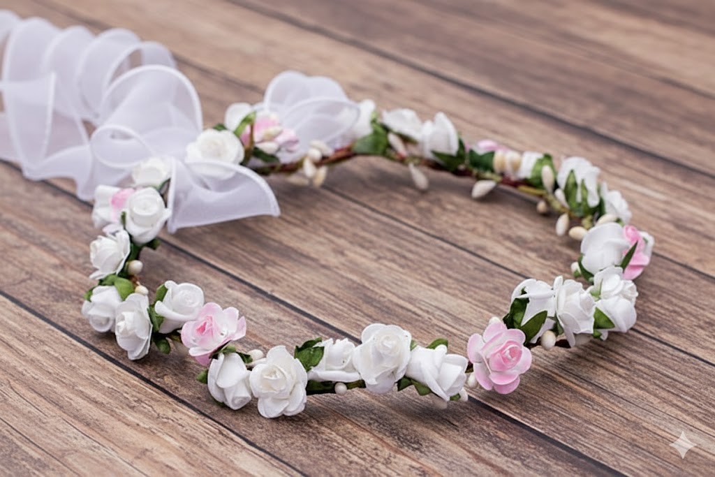 Ten wianek komunijny to idealny wybór dla dziewczynek ceniących naturalność, lekkość i ponadczasową elegancję. Smukła forma, drobne różyczki i zwiewna kokarda tworzą subtelną ozdobę, która pięknie podkreśla wyjątkowy charakter Pierwszej Komunii Świętej i pozostaje pamiątką na lata.