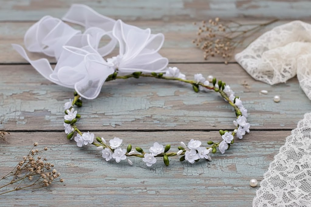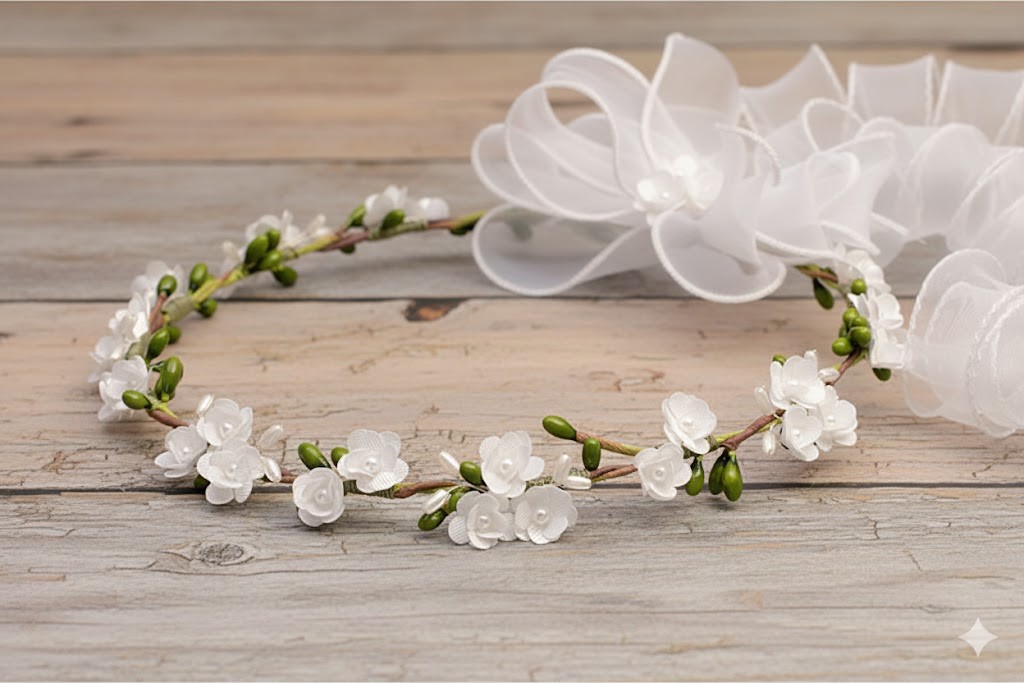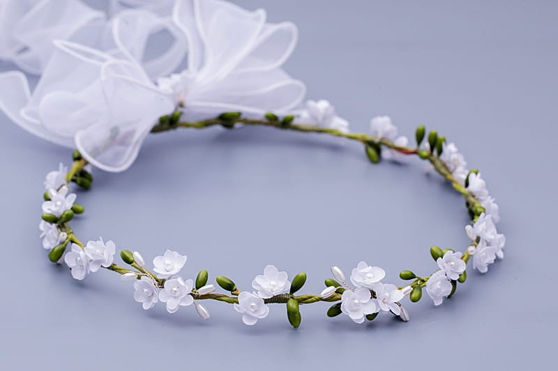 Wianek wykonano z wysokiej jakości materiałów i osadzono na elastycznym stelażu ukrytym w konstrukcji. Dzięki temu doskonale dopasowuje się do głowy dziecka, nie uciska i nie zsuwa się podczas noszenia. Całość dopełnia lekka, półtransparentna kokarda z organzy z delikatnymi wstążkami, podkreślająca uroczysty, a zarazem naturalny charakter Pierwszej Komunii Świętej.