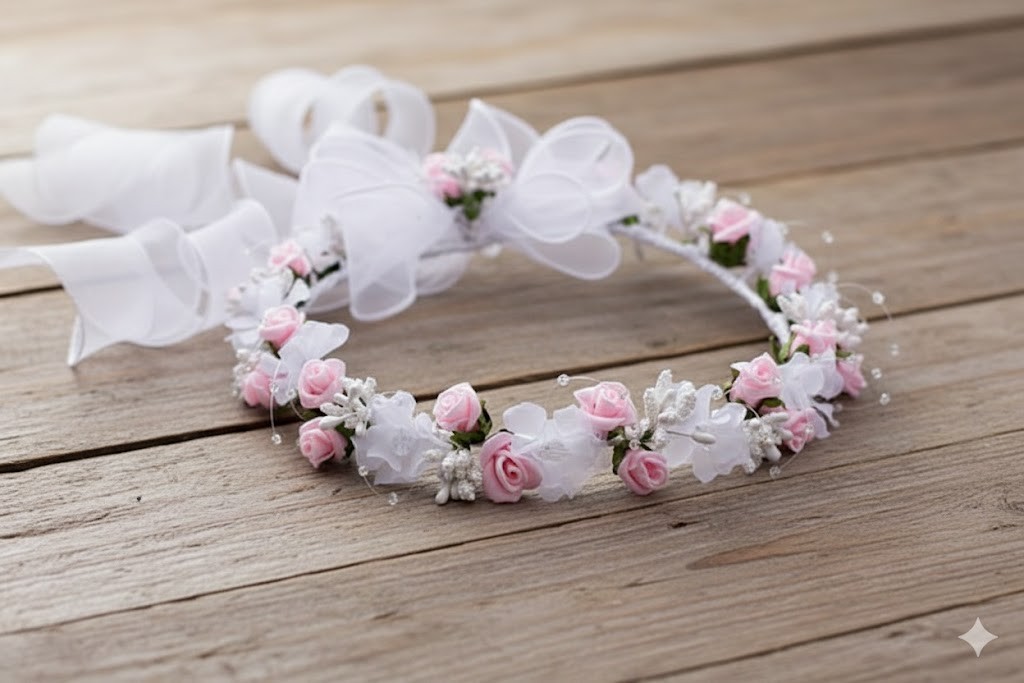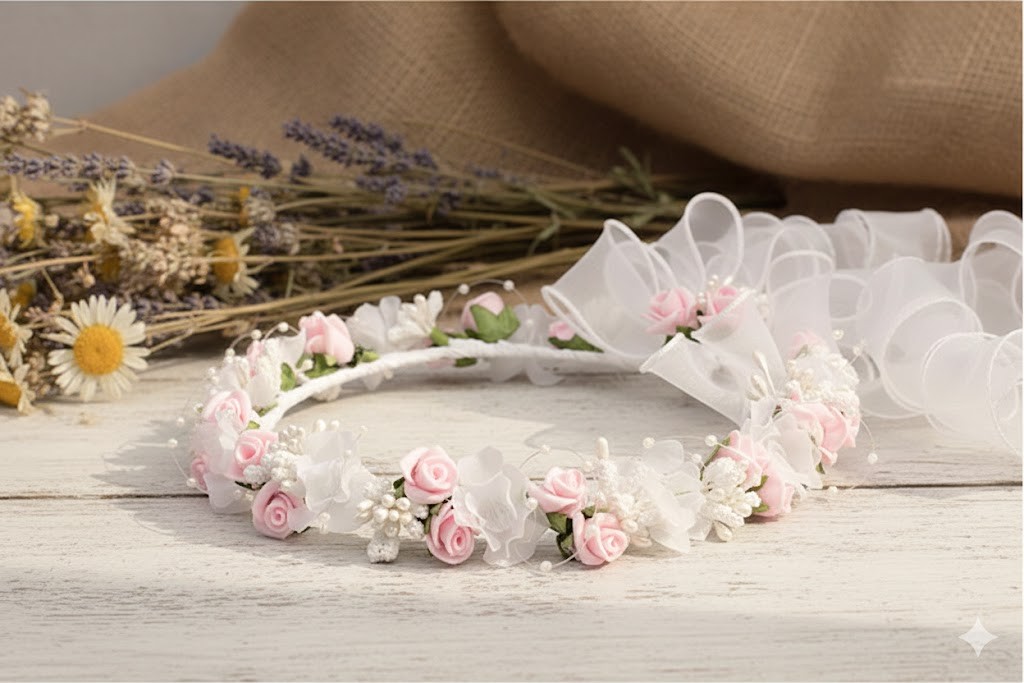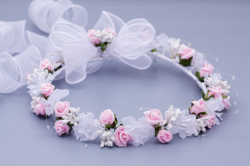 Wianek komunijny – delikatna biel z pudrowym różem i perłowym blaskiem