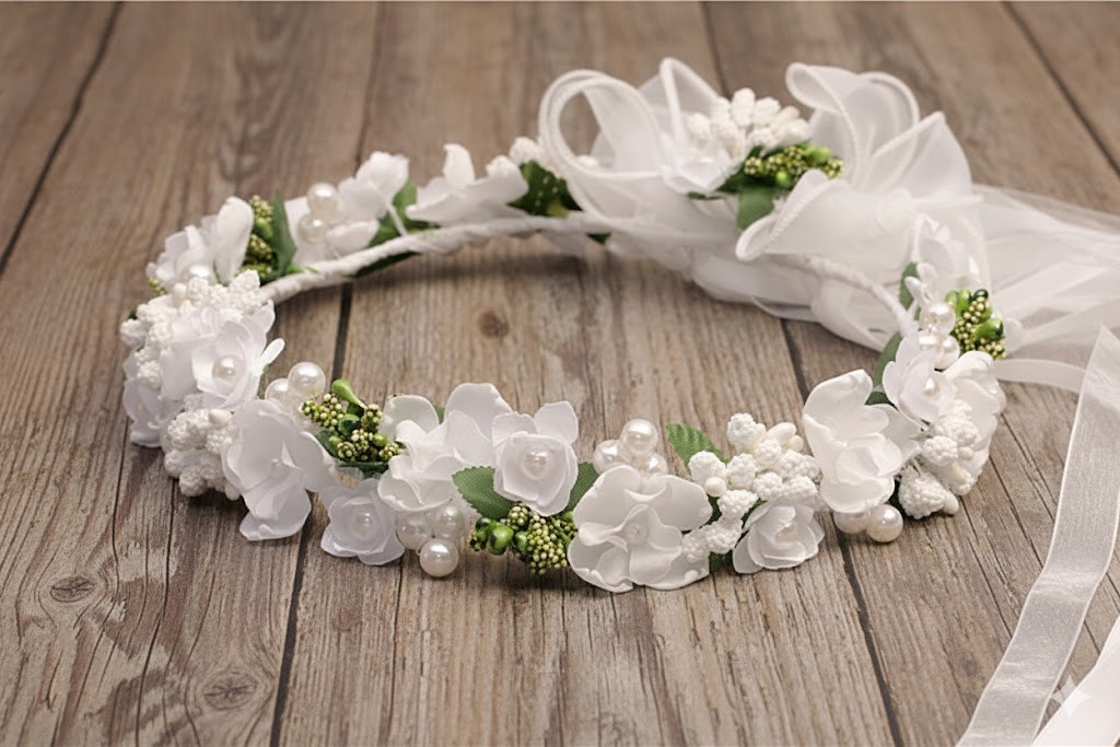 Wianek komunijny z najnowszej kolekcji to harmonijne połączenie klasycznej bieli z delikatnymi perłowymi akcentami i naturalną zielenią. Kompozycję tworzą drobne białe kwiaty o miękkiej, lekkiej formie, uzupełnione perełkami, zielonymi pączkami oraz subtelnymi listkami. Całość prezentuje się bardzo dziewczęco, elegancko i spokojnie – idealnie na dzień Pierwszej Komunii Świętej.