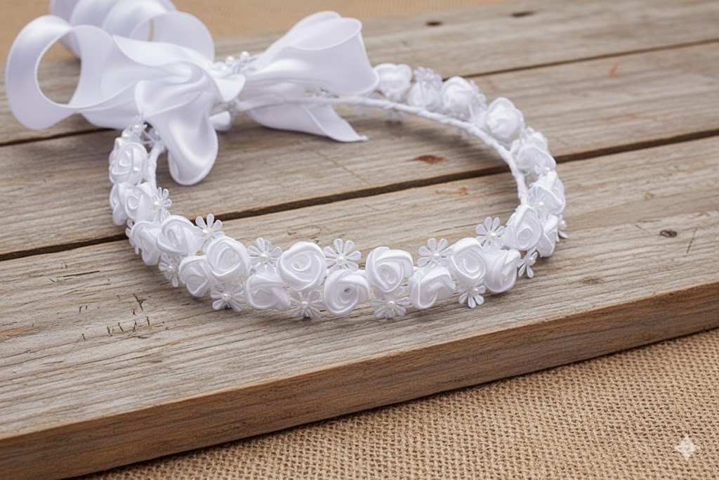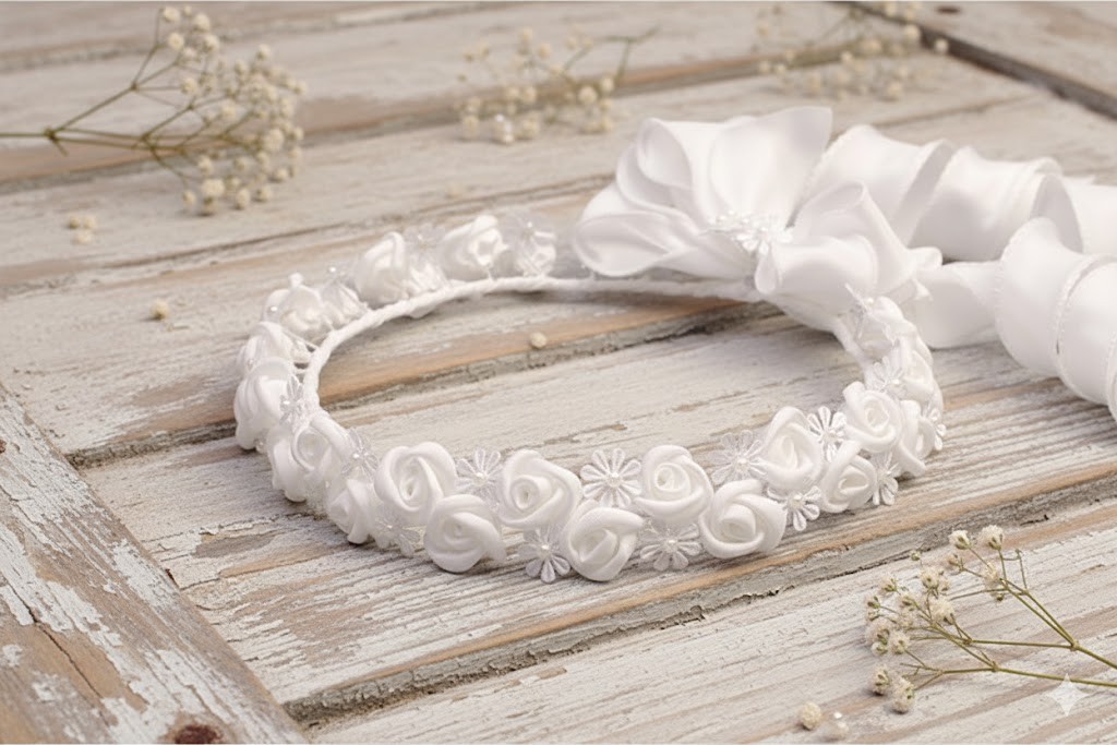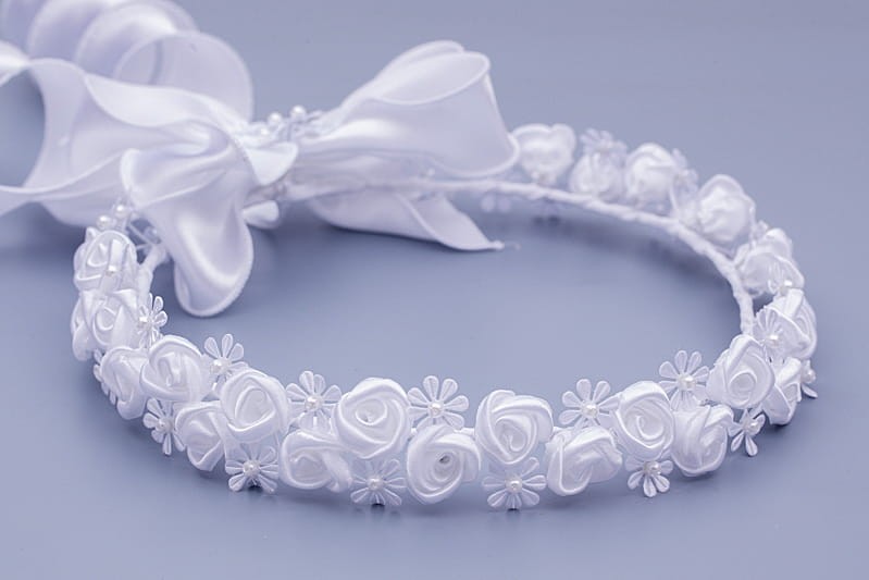 Wianek komunijny – satynowa klasyka w czystej bieli