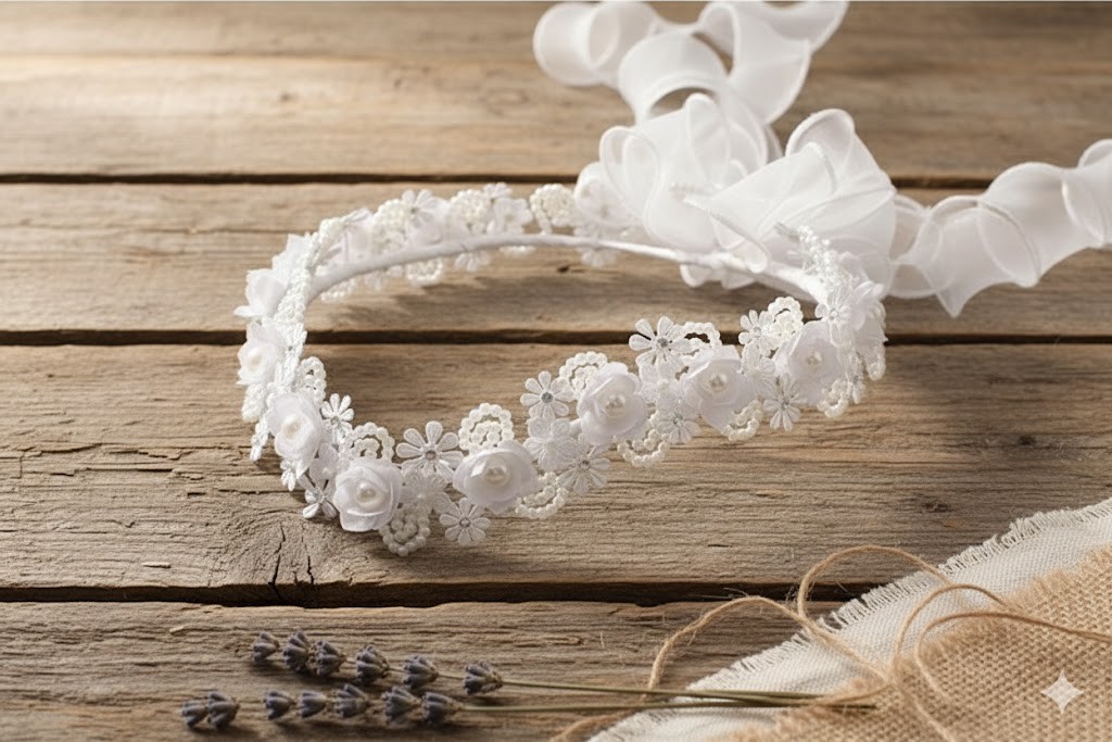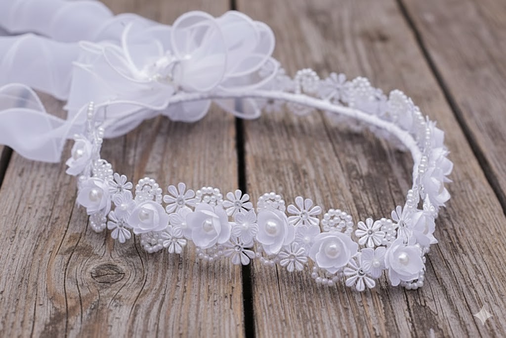 Model wykonany został z wysokiej jakości, realistycznych materiałów i osadzony na elastycznym stelażu ukrytym w konstrukcji. Dzięki temu wianek idealnie dopasowuje się do głowy dziecka, nie powoduje ucisku i pozostaje stabilny przez cały dzień uroczystości. Całość dopełnia zwiewna kokarda z organzy z delikatnymi wstążkami, podkreślająca sakramentalny charakter Pierwszej Komunii Świętej.