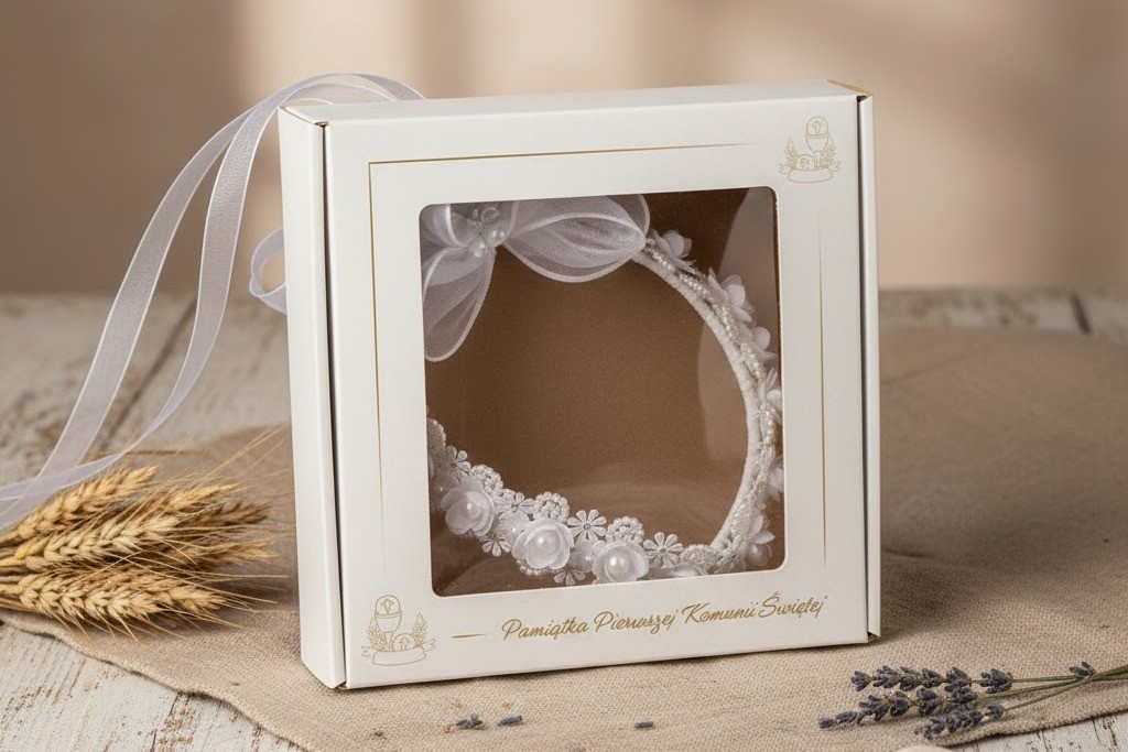 W e-Dewocjonalia dostępne są również eleganckie torebki komunijne, rękawiczki oraz delikatna biżuteria, które doskonale uzupełniają klasyczny charakter tego wianka.