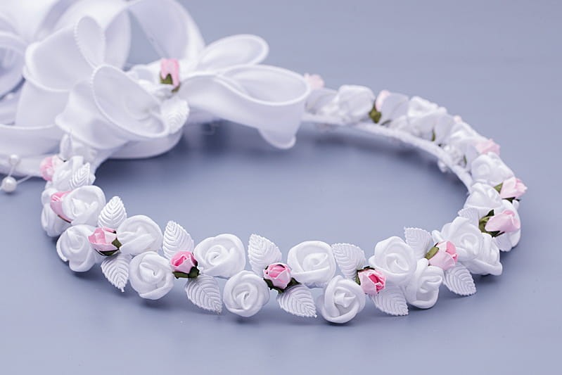 Wianek komunijny – klasyczna biel z subtelnym różowym akcentem
