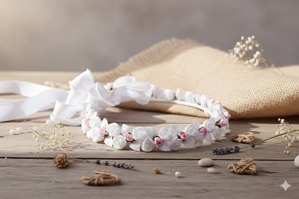 Ten wianek komunijny to połączenie klasycznej elegancji, delikatności i komfortu noszenia. Subtelne różowe akcenty nadają mu wyjątkowego uroku, a lekka konstrukcja sprawia, że jest idealnym wyborem na dzień Pierwszej Komunii Świętej i piękną pamiątką na lata.
