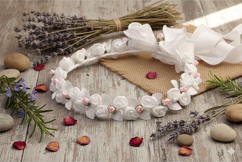 Model osadzony jest na elastycznym stelażu ukrytym w konstrukcji, dzięki czemu wianek idealnie dopasowuje się do głowy dziecka, nie uciska i nie zsuwa się podczas noszenia. Całość dopełnia elegancka kokarda z lekkimi wstążkami, podkreślająca uroczysty i sakramentalny charakter ozdoby.
