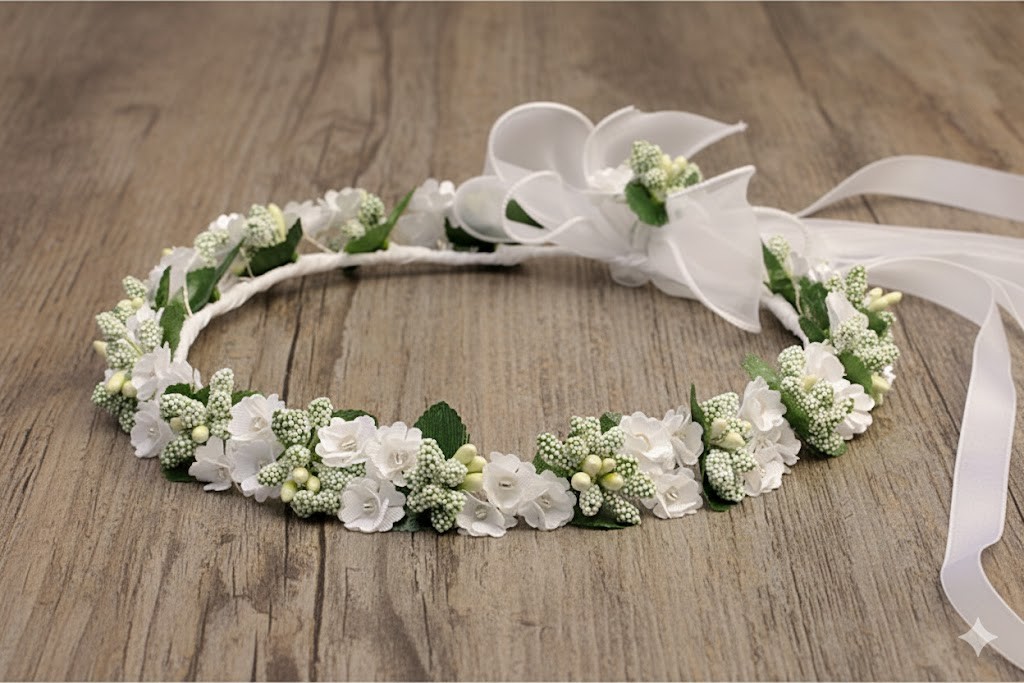 Ten wianek komunijny to idealny wybór dla osób ceniących naturalność, świeżość i subtelną elegancję. Białe kwiaty i zielone pączki tworzą lekką, harmonijną ozdobę, która pięknie podkreśla wyjątkowy charakter Pierwszej Komunii Świętej i pozostaje pamiątką na lata.