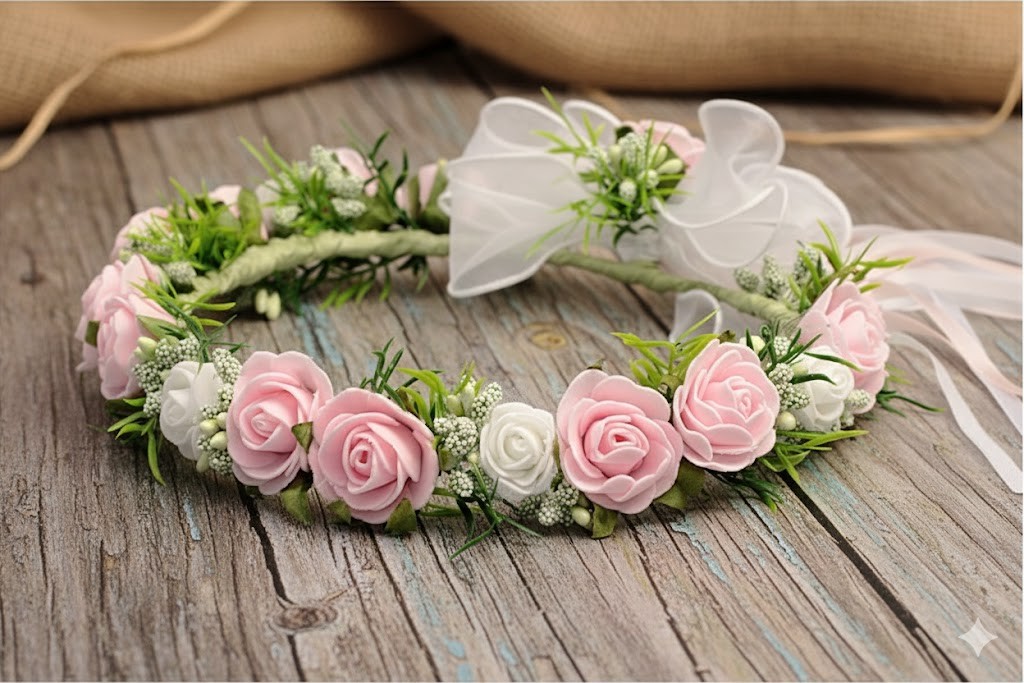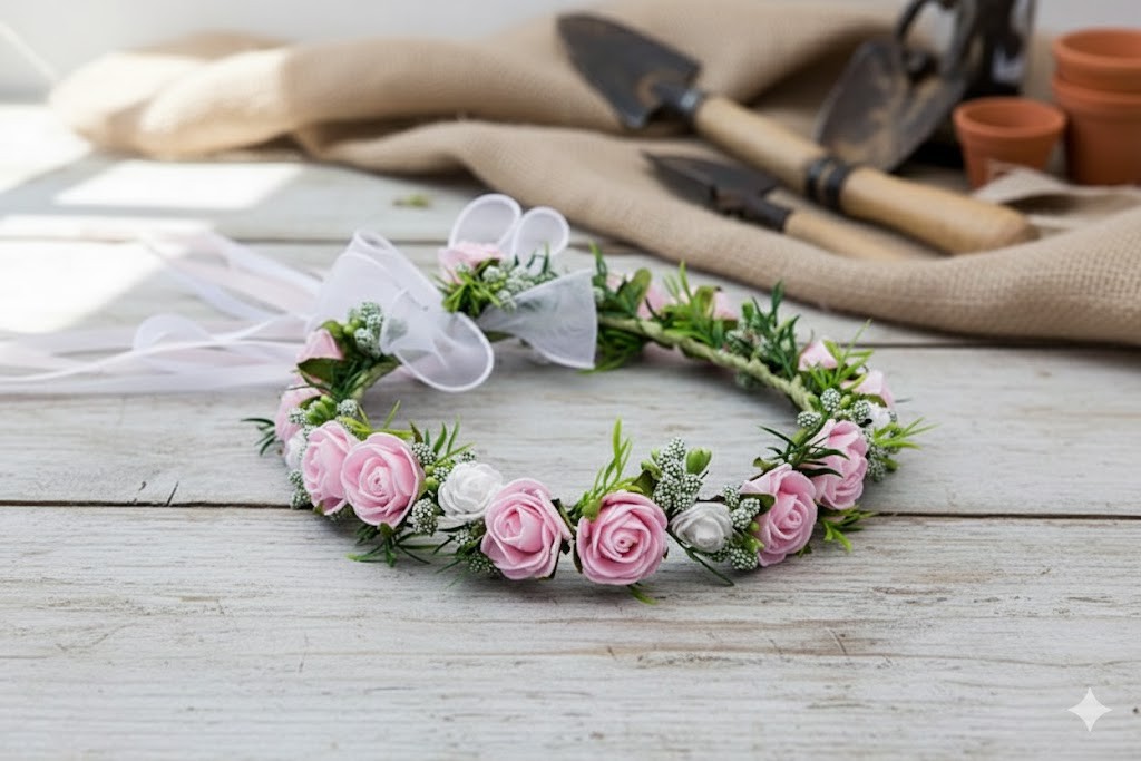 Model wykonany został z wysokiej jakości, realistycznych materiałów i osadzony na elastycznym stelażu ukrytym w konstrukcji. Dzięki temu wianek idealnie dopasowuje się do głowy dziecka, nie powoduje ucisku i pozostaje stabilny przez cały dzień. Całość dopełnia zwiewna kokarda z organzy z delikatnymi wstążkami, dodająca lekkości i elegancji.