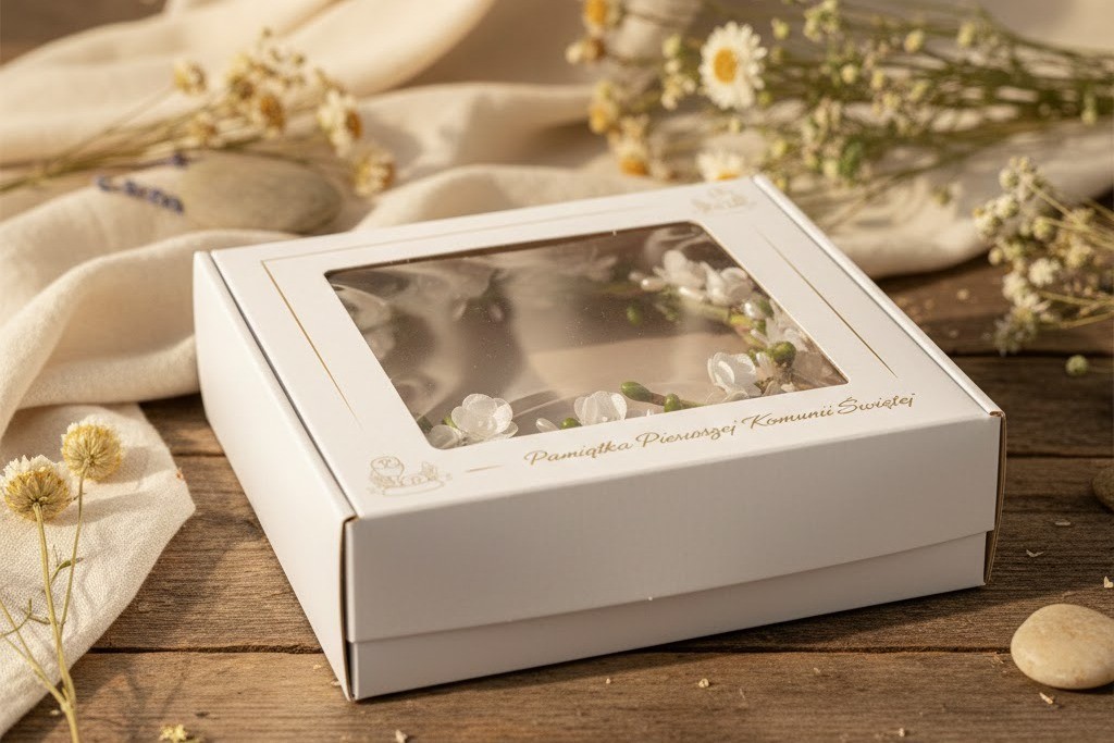 W e-Dewocjonalia dostępne są również eleganckie torebki komunijne, rękawiczki oraz delikatna biżuteria, które pięknie uzupełniają pastelowo-naturalny charakter tego wianka.