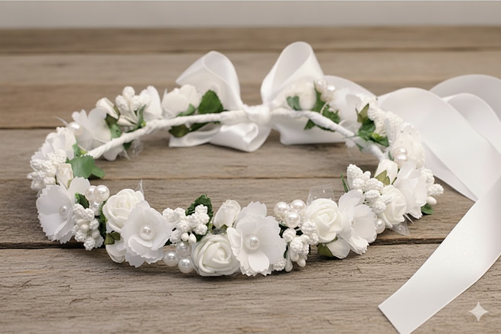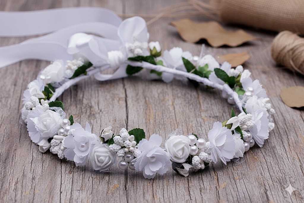 Ten wianek komunijny to kwintesencja klasyki i elegancji. Białe kwiaty, perłowe akcenty i satynowa kokarda tworzą harmonijną, spokojną ozdobę, która pięknie podkreśla rangę Pierwszej Komunii Świętej i pozostaje pamiątką na długie lata.