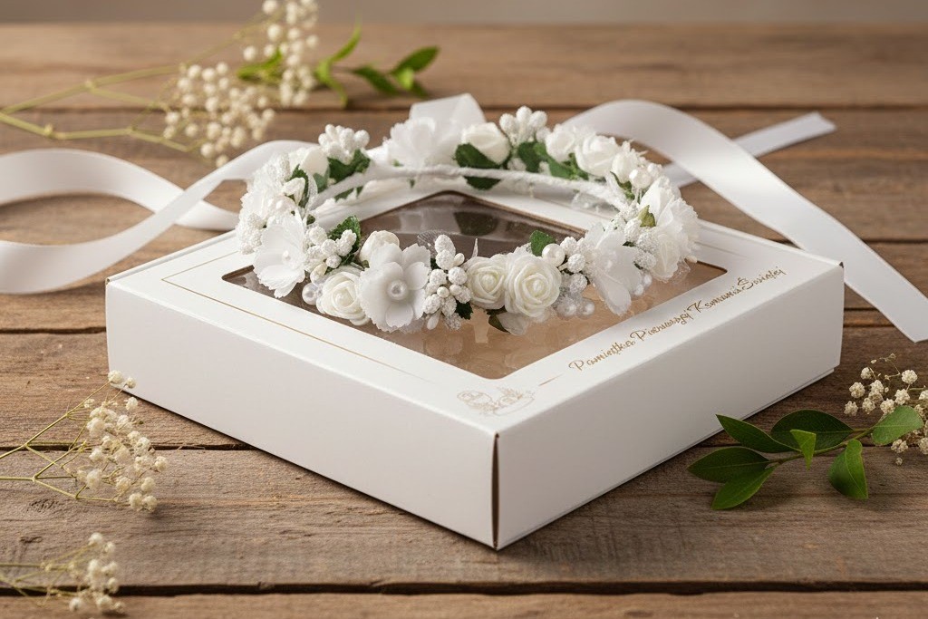 Model wykonany został z wysokiej jakości, realistycznych materiałów i osadzony na elastycznym stelażu ukrytym w konstrukcji. Dzięki temu wianek idealnie dopasowuje się do głowy dziecka, nie powoduje ucisku i pozostaje stabilny przez cały dzień uroczystości. Całość dopełnia klasyczna, satynowa kokarda z gładkimi wstążkami, podkreślająca sakramentalny charakter ozdoby.