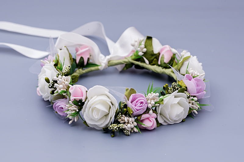Z tyłu wianka znajduje się biała, satynowa wstążka, która: