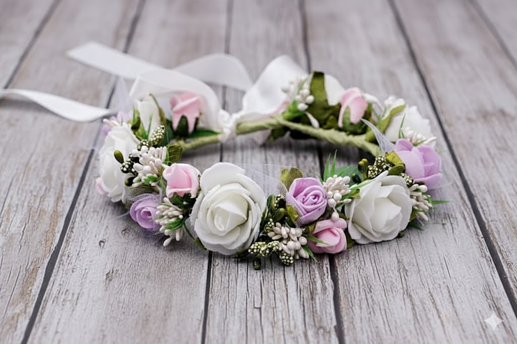 Ten wianek komunijny na koczek to połączenie klasycznej elegancji i pastelowej delikatności. Biel, pudrowy róż i liliowe akcenty tworzą subtelną ozdobę, która pięknie podkreśla fryzurę komunijną i pozostaje wyjątkową pamiątką na lata.