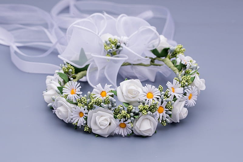 Wianek komunijny na koczek – biel z rumiankami i zielonymi akcentami