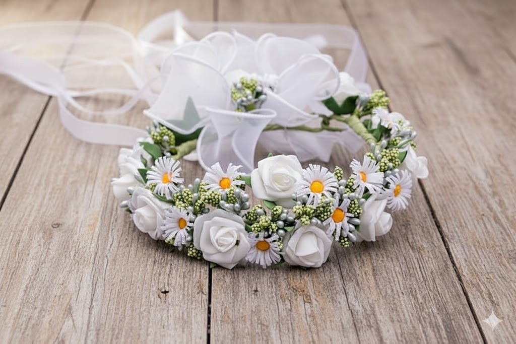 Klasyczny wianek komunijny na koczek to delikatna i naturalna ozdoba fryzury, inspirowana motywami kwiatowymi. Dominują tu białe róże oraz drobne rumianki z żółtym środkiem, subtelnie uzupełnione zielonymi pączkami i listkami. Kompozycja jest lekka, świeża i bardzo dziewczęca, idealnie wpisująca się w uroczysty charakter Pierwszej Komunii Świętej.