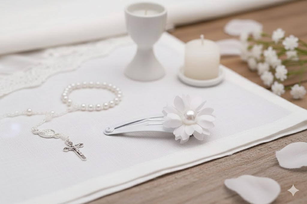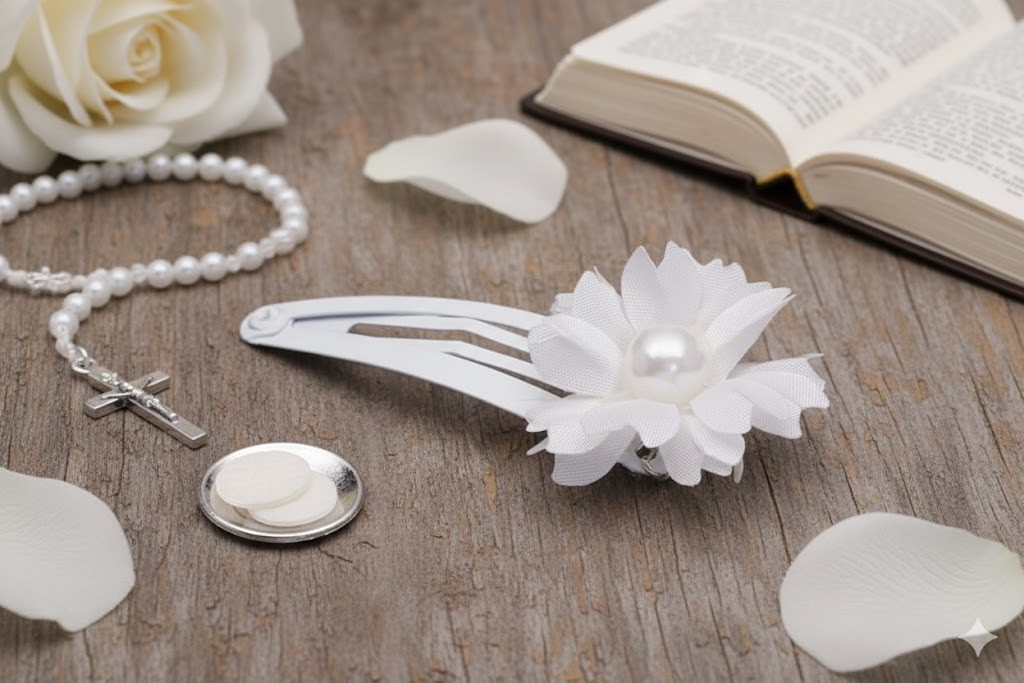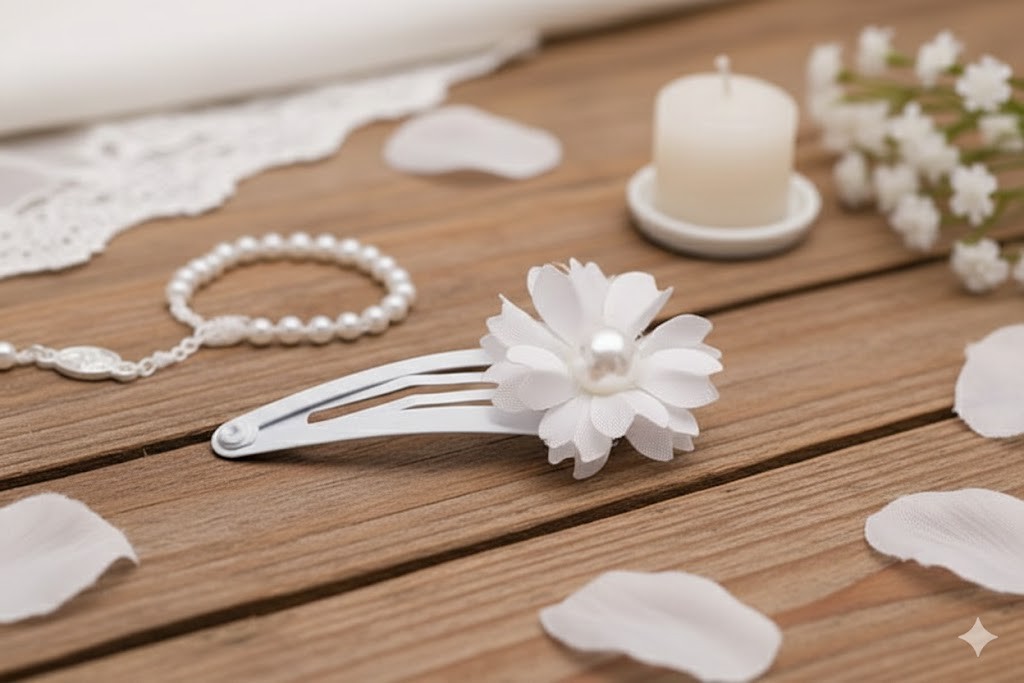 Ta wsuwka komunijna do włosów to klasyczna i subtelna ozdoba, która doskonale wpisuje się w tradycyjną estetykę Pierwszej Komunii Świętej. Delikatny biały kwiat o lekkiej, warstwowej formie został uzupełniony o perłowy środek, nadający całości eleganckiego, odświętnego charakteru.