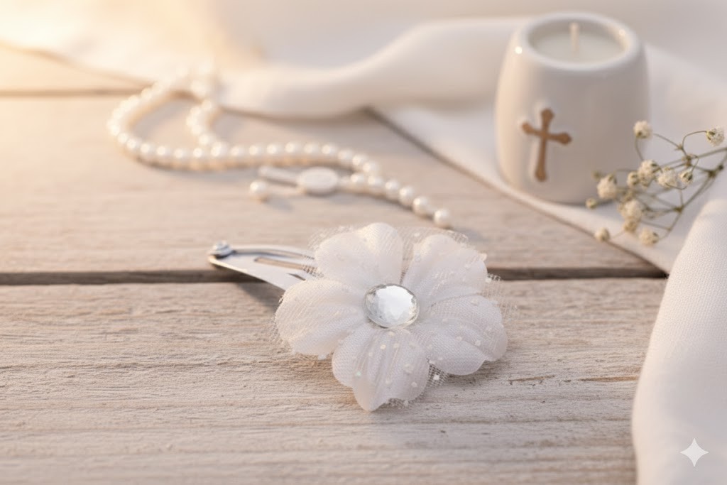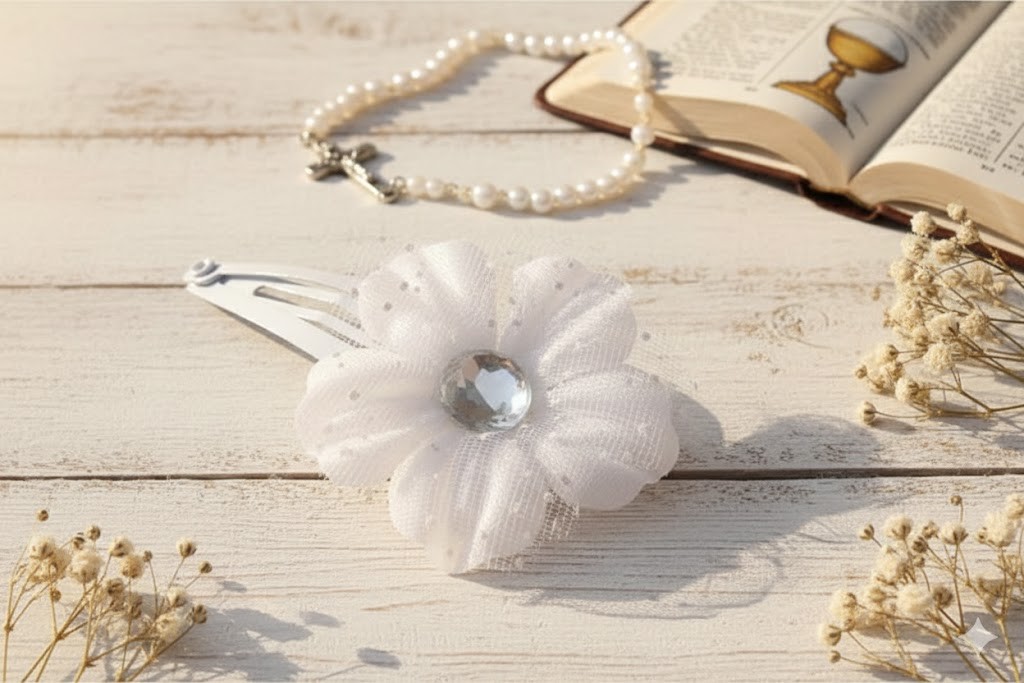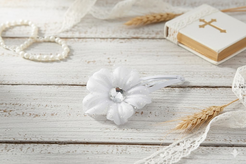 Ta wsuwka komunijna do włosów to wyjątkowo lekka i subtelna ozdoba, stworzona z myślą o dziewczęcych, delikatnych fryzurach komunijnych. Biały kwiat wykonany z tiulu o drobnej strukturze został połączony z centralnie umieszczonym kryształowym elementem, który nadaje całości eleganckiego, ale bardzo stonowanego blasku.