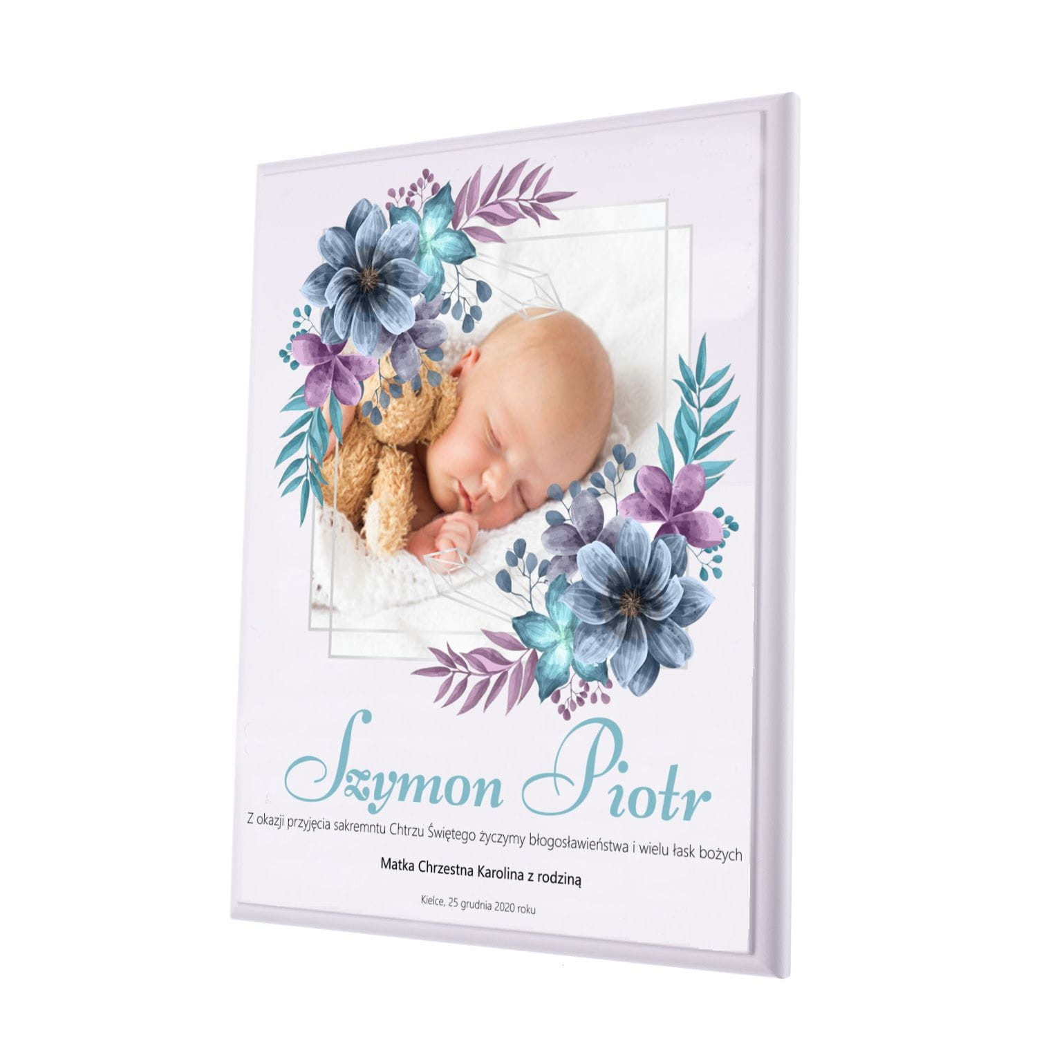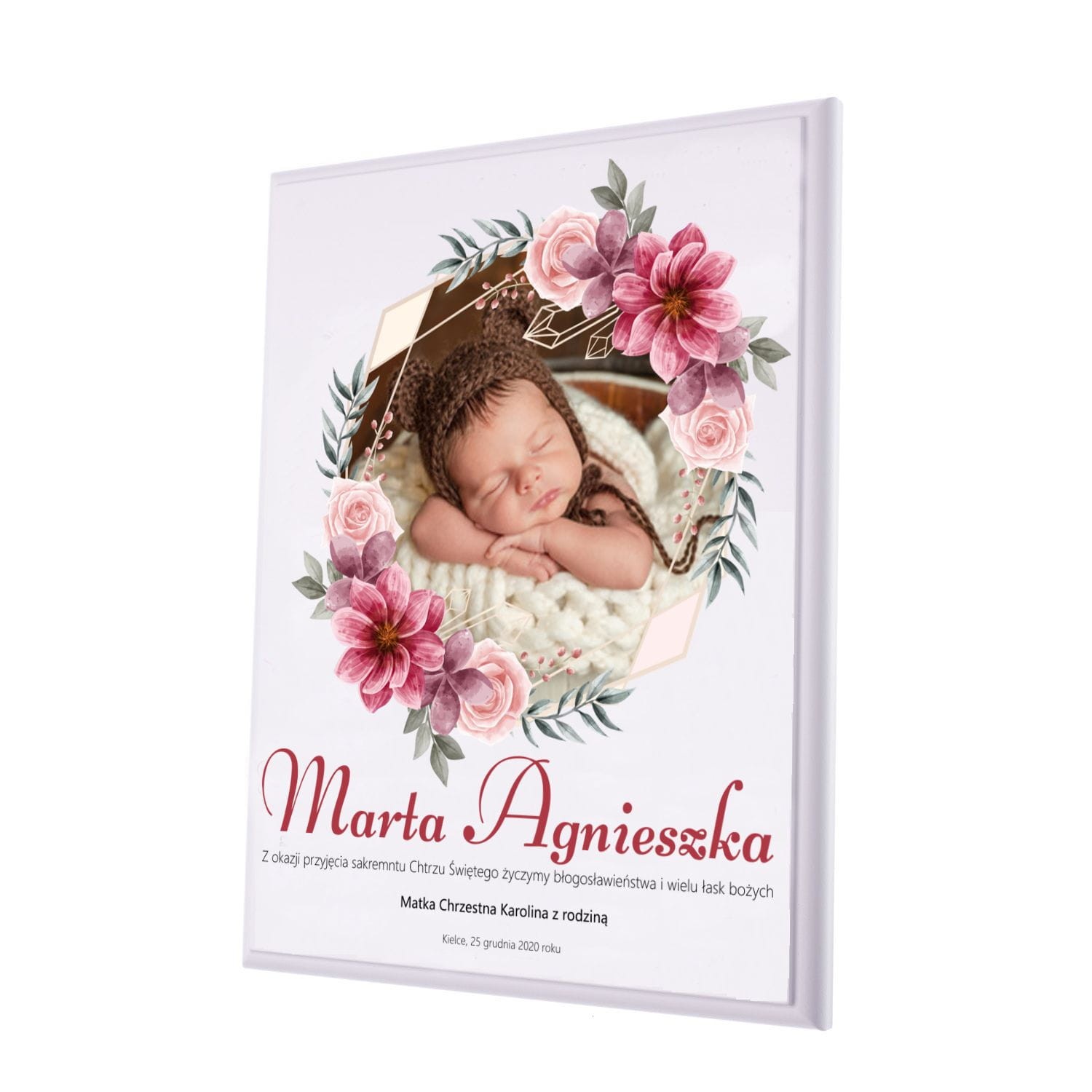 Spersonalizowany projekt pamiątkowy wykonany jest metodą druku UV na białym, drewnianym podkładzie, będzie idealnym prezentem na Chrzest Święty lub roczku czy narodzin.
