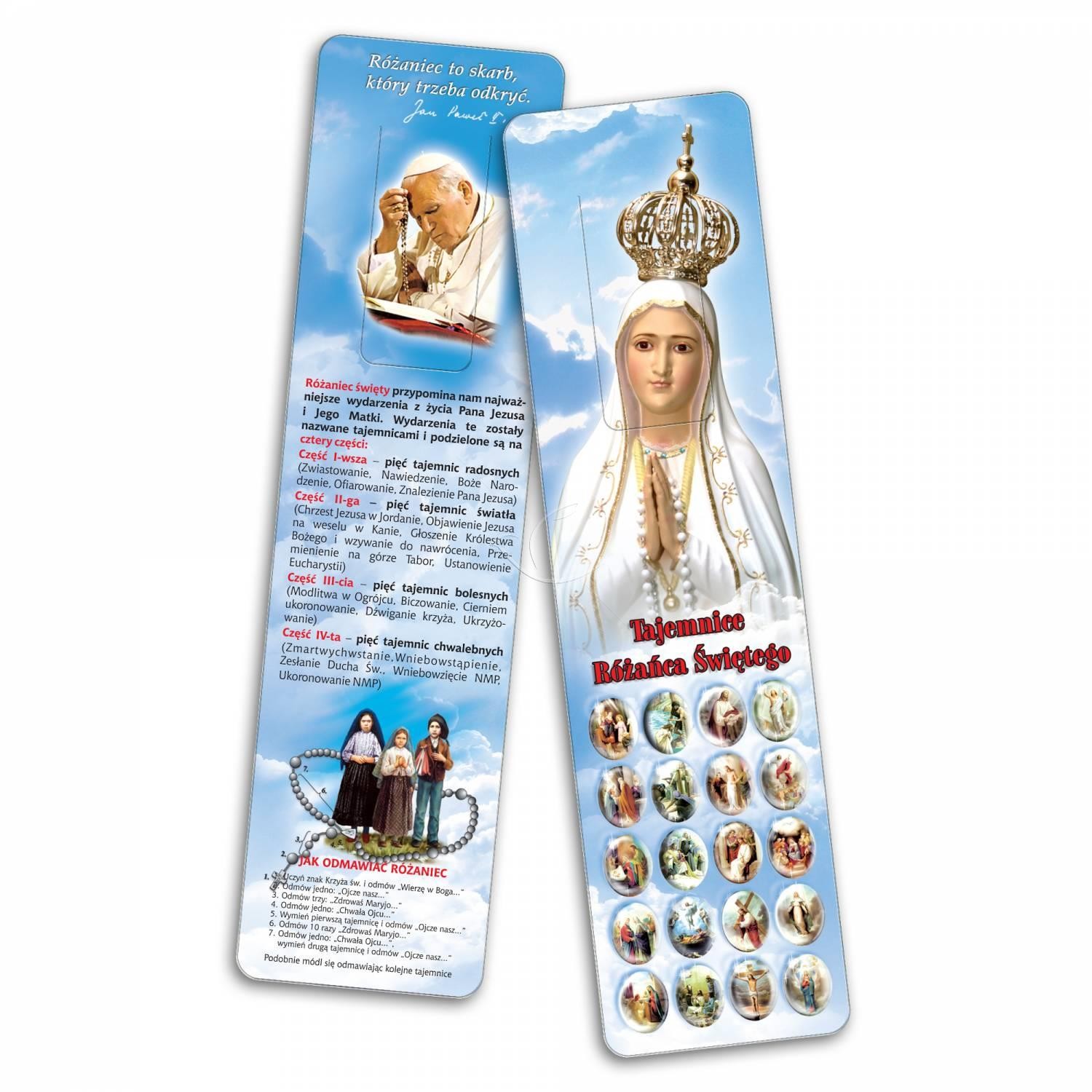 Na jednej stronie znajduje się wizerunek Matki Bożej Fatimskiej wraz z kompletnym zestawem miniatur przedstawiających wszystkie cztery części Różańca: radosne, światła, bolesne i chwalebne. Druga strona zawiera opis tajemnic, wskazówki dotyczące rozważań oraz sentencje duchowe (m.in. słowa Jana Pawła II: „Różaniec to skarb, który trzeba odkryć”).
