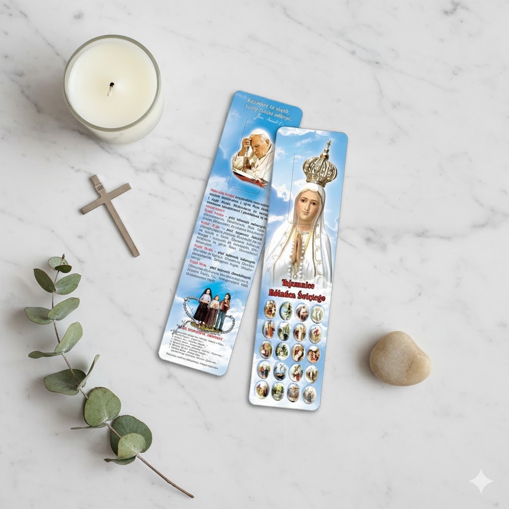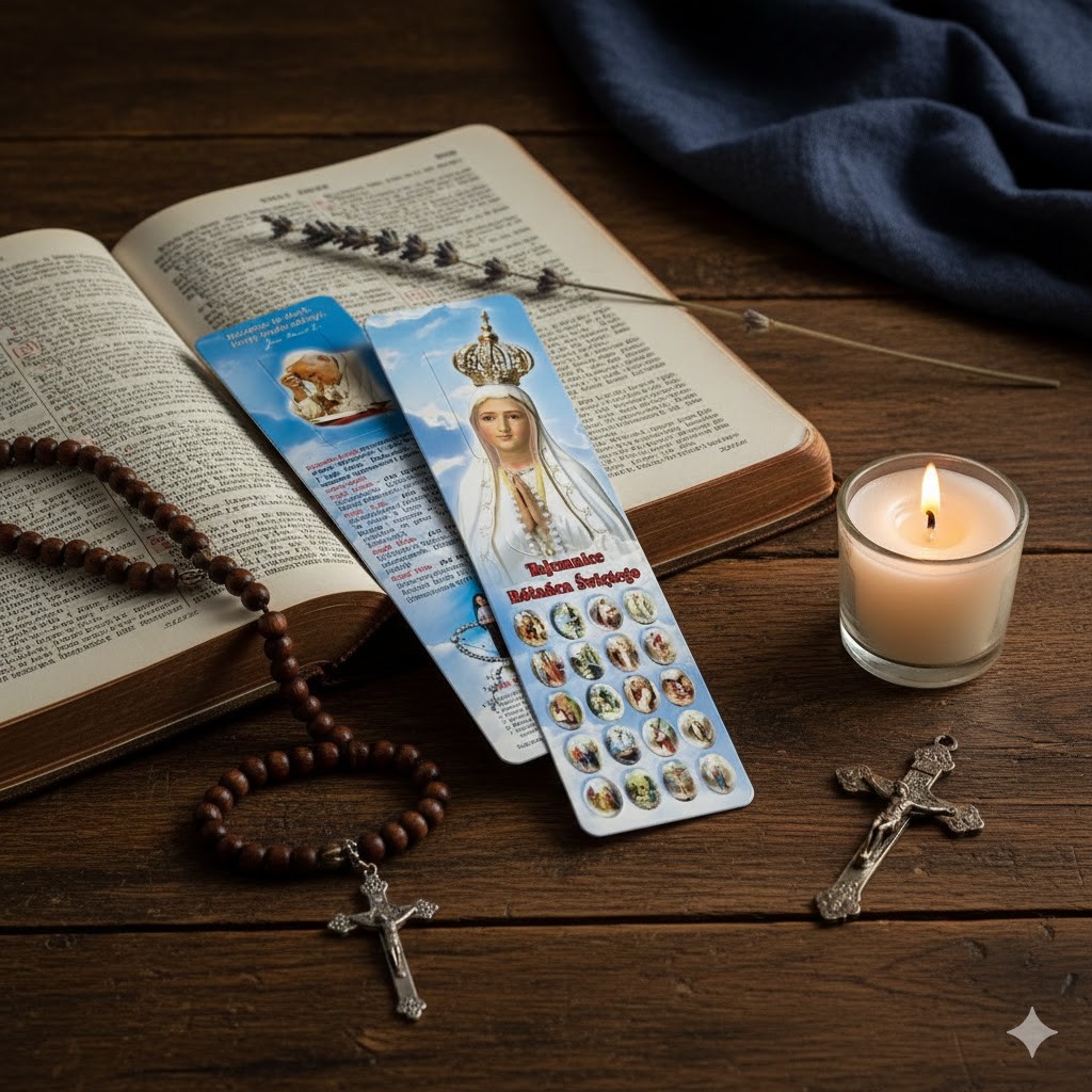 Zakładka „Tajemnice Różańca Świętego” to piękny i praktyczny dodatek dla osób, które pragną łączyć codzienne czytanie z modlitewną inspiracją. Wykonana w formie dwustronnego druku, przedstawia wyraźne, kolorowe ilustracje wszystkich tajemnic różańcowych oraz krótkie objaśnienia.