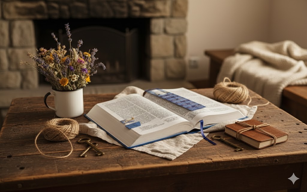 Motyw religijny: „W Biblii znajdziesz pomoc” – wyraźne przesłanie duchowe, które przypomina o wartości Słowa Bożego.