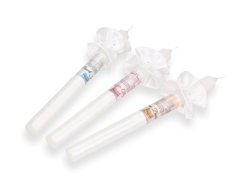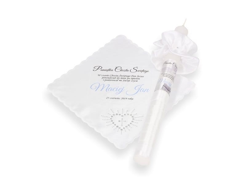 W zestawie świeca ręcznie dekorowana z ozdobnym stroikiem, dzięki któremu nie potrzebujesz już dodatkowych okapników; atłasowa szatka w formie chusteczki z aplikacją dżetów oraz delikatny nadruk personalizacji (imię i data).