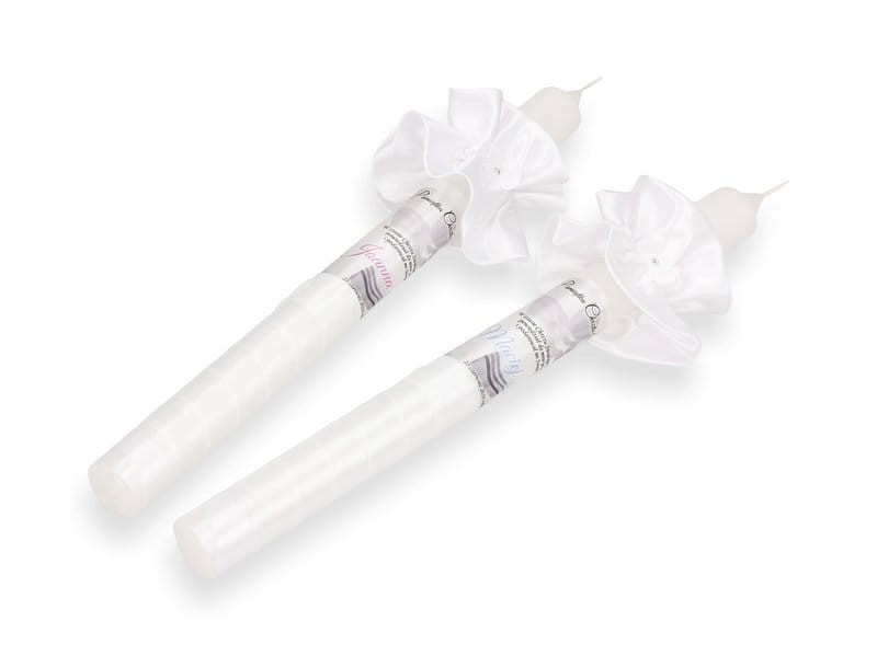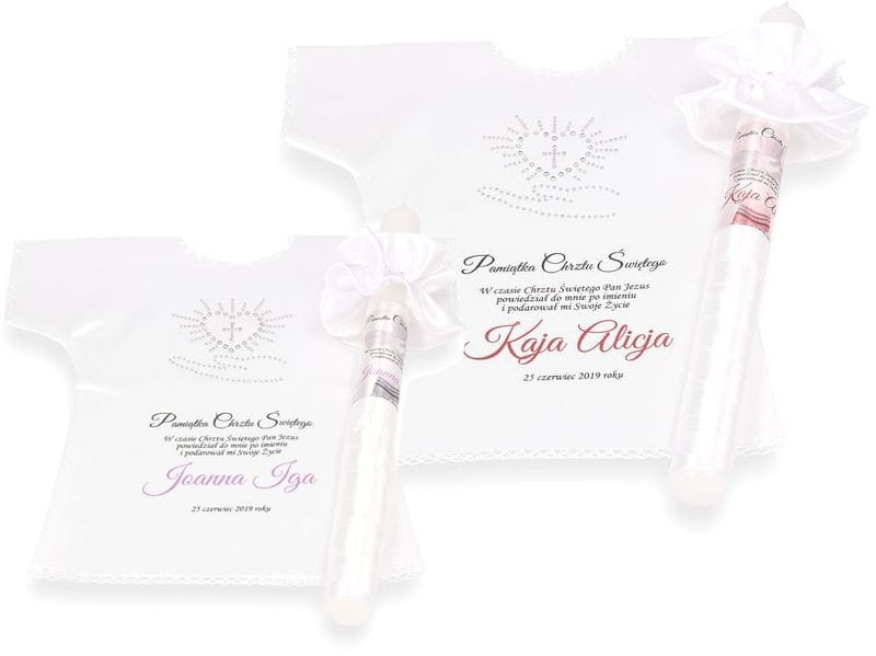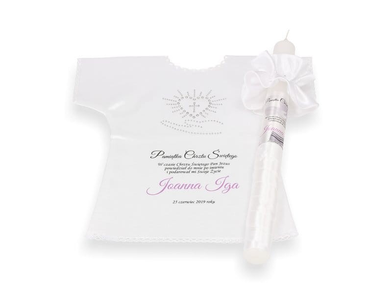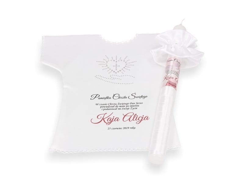 W zestawie świeca ręcznie dekorowana z ozdobnym stroikiem, dzięki któremu nie potrzebujesz już dodatkowych okapników; atłasowa szatka w formie koszulki z aplikacją dżetów oraz delikatny nadruk personalizacji (imię i data).