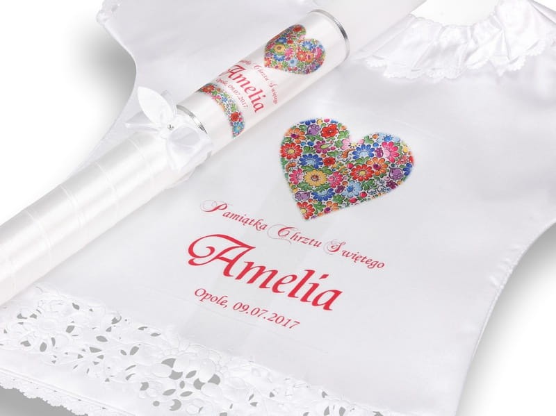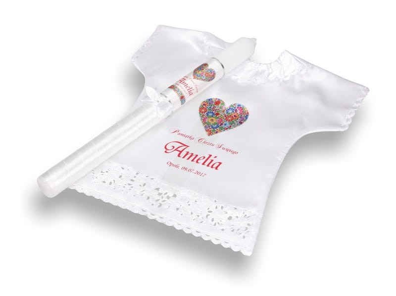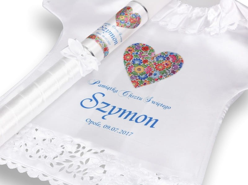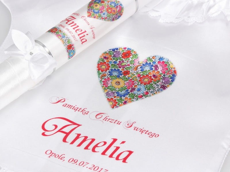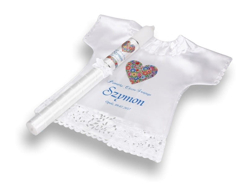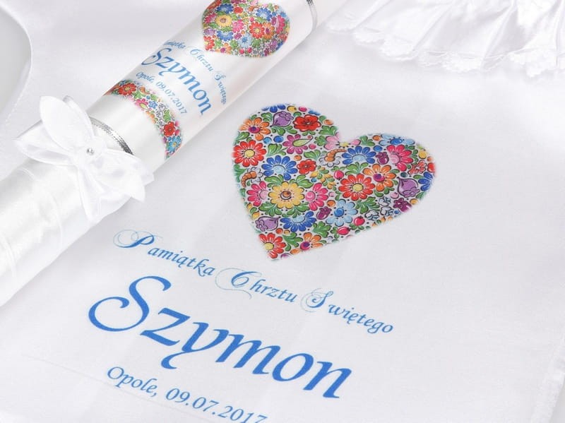 Drobny wzór kwiatowy, tzw. „opolskim” - wzorując się na Opolskiej Porcelanie, kunsztownie zdobionej wzorem kwiatowym, stworzyliśmy dla Państwa zestaw do Chrztu Świętego, składający się z szatki i świecy - rękodzieło promujące polską sztukę ludową. W pięknie skomponowanych wzorach kolorowych kwiatów zachowała się cała śląska tradycja. Tak istotna w czasach współczesnych, gdy coraz bardziej docenia się walory regionalne a dla lokalnych środowisk małe ojczyzny maja coraz większe znaczenie.