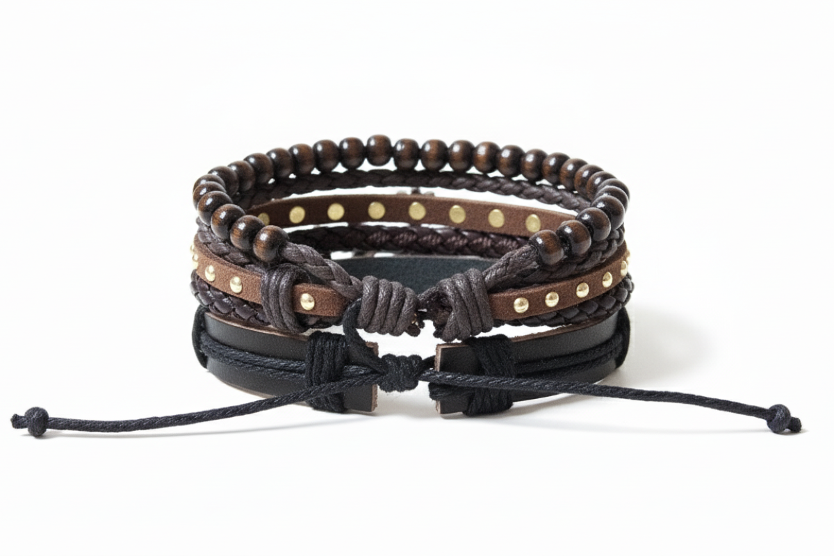 Zestaw pięciu bransoletek to propozycja dla mężczyzny, który lubi podkreślać swój styl detalem – ale bez przesady. Naturalne odcienie brązu, szlachetny wygląd skóry i drewna oraz obecność krzyża tworzą akcesorium, które może wyrażać zarówno charakter, jak i dyskretną duchowość. To ozdoba, która „nosi się sama” – pasuje do jeansów, koszul, koszulek, stylu codziennego i bardziej wyrazistych stylizacji.