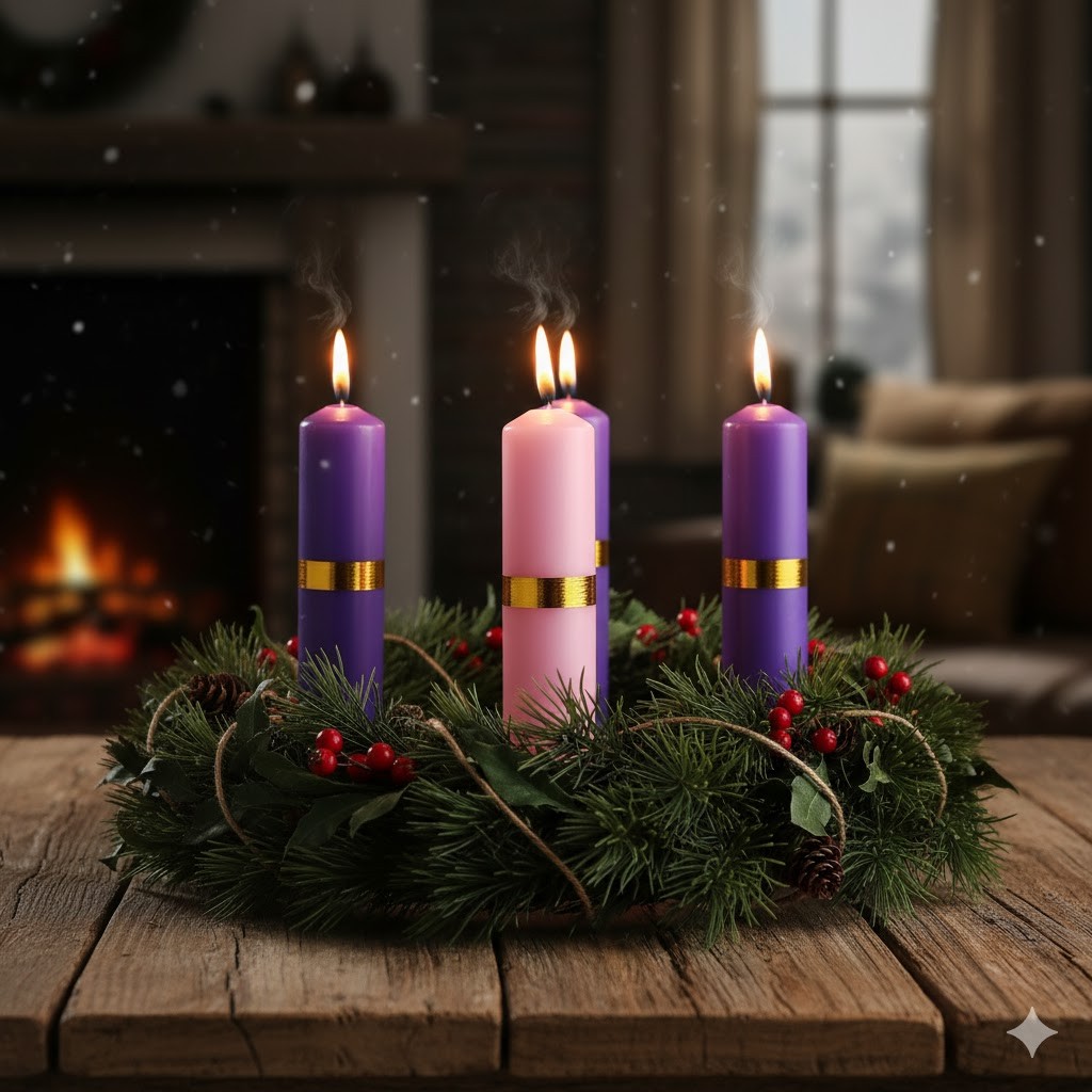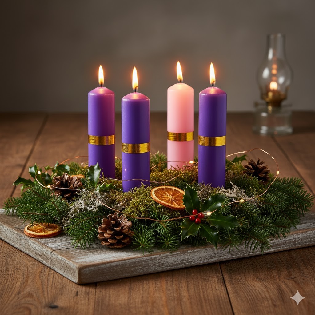 Kolory liturgiczne — fiolet i róż — pozwalają zachować symbolikę adwentową.