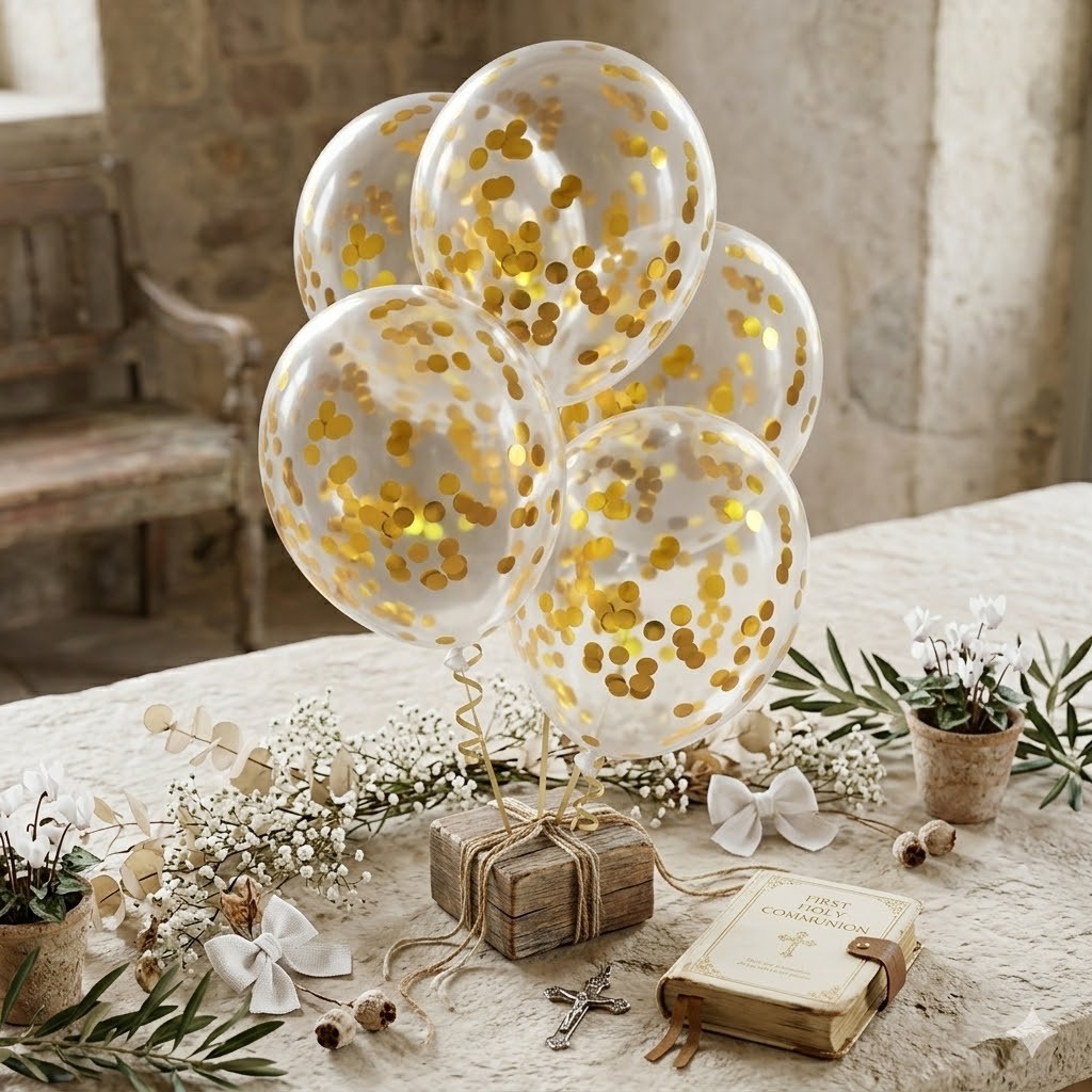 Dekoracyjne balony przezroczyste ze złotym konfetti to efektowny element dekoracji na różnego rodzaju uroczystości rodzinne i religijne. Subtelny wygląd oraz klasyczna kolorystyka sprawiają, że pasują zarówno do przyjęć komunijnych, jak i chrztów czy innych wydarzeń okolicznościowych.