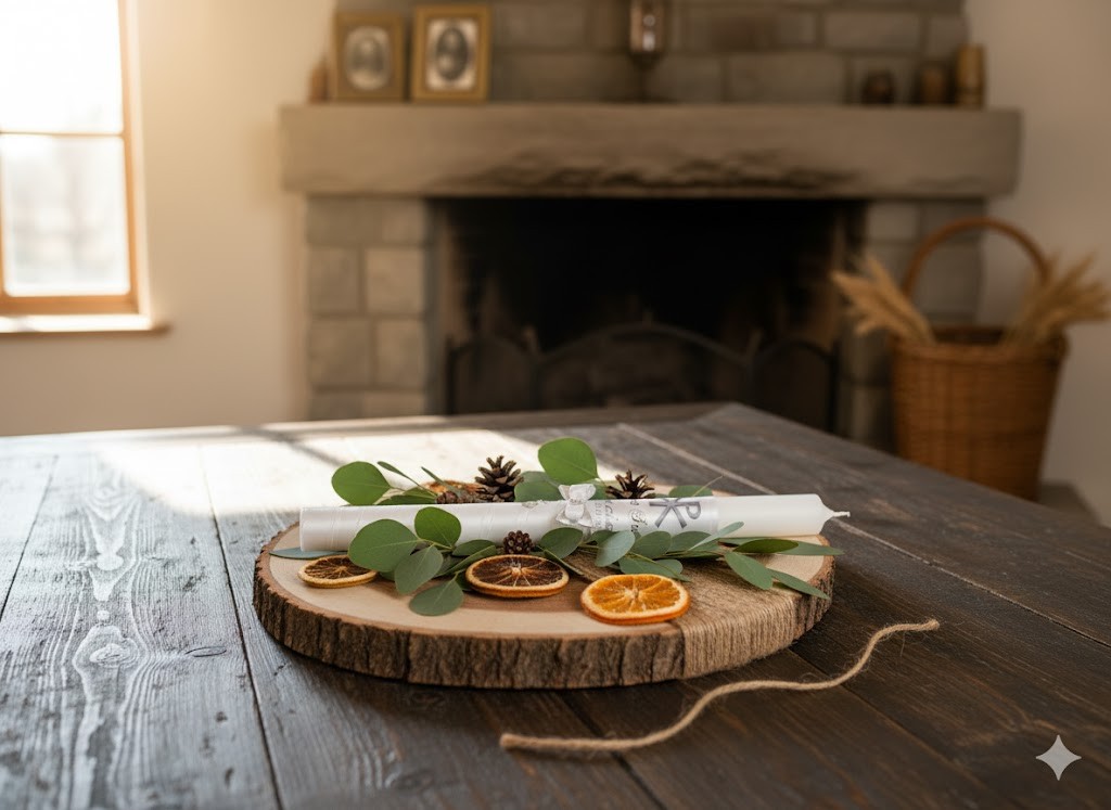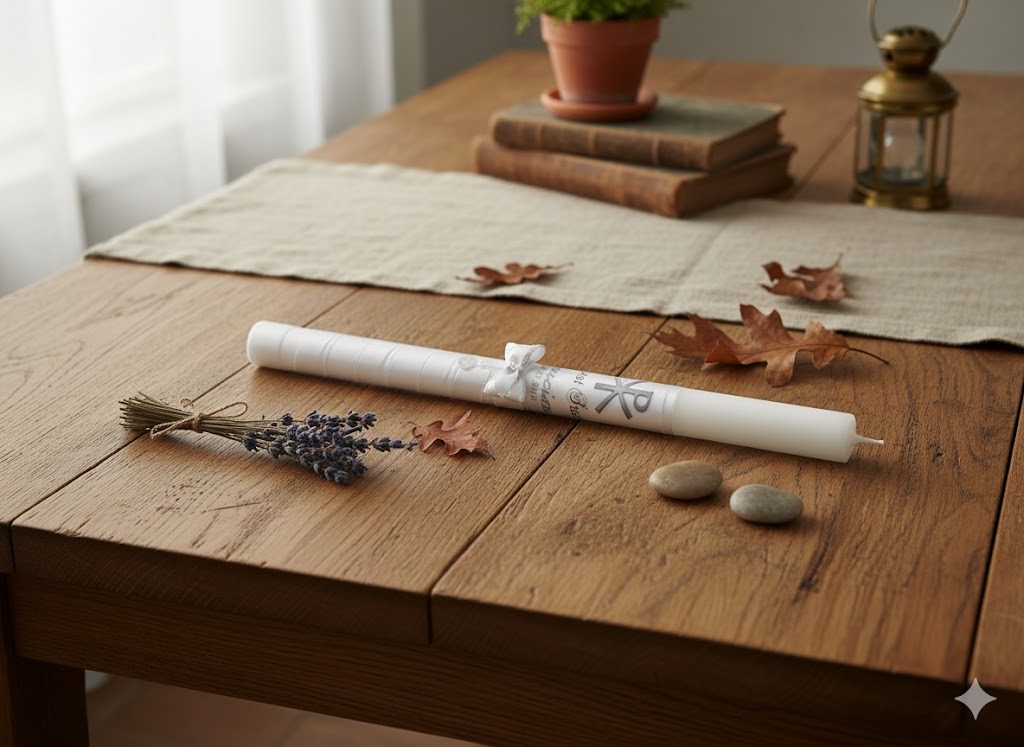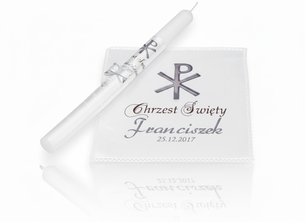 W skład zestawu wchodzi ręcznie zdobiona świeca udekorowana medalikiem oraz atłasowa szatka z nadrukiem XP, wykonana w stylu delikatnej chusteczki. Całość tworzy elegancki, sakralny komplet, który idealnie podkreśla uroczystość sakramentu Chrztu Świętego.